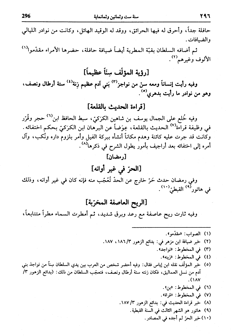 (¬5) خبر المؤلّف نقله ابن إياس فقال: وفيه أحضر شخص من العرب بين يدي السلطان سنا من نواجذ بني آدم من نسل العماليق، فكان زنته ستة أرطال ونصف، فتعجّب السلطان من ذلك: (بدائع الزهور 3/ 187).