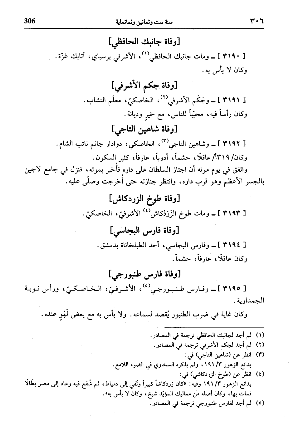 (¬4) انظر عن (طوخ الزردكاشي) في: بدائع الزهور 3/ 191 وفيه: «كان زردكاشا كبيرا ونفي إلى دمياط، ثم شفع فيه وعاد إلى مصر بطّالا فمات بها، وكان أصله من مماليك المؤيّد شيخ، وكان لا بأس به».