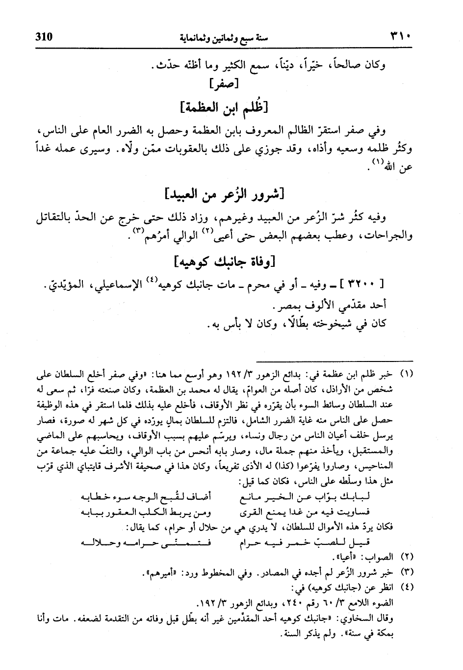 (¬1) خبر ظلم ابن عظمة في: بدائع الزهور 3/ 192 وهو أوسع مما هنا: «وفي صفر أخلع السلطان على شخص من الأراذل، كان أصله من العوامّ، يقال له محمد بن العظمة، وكان صنعته فرّا، ثم سعى له عند السلطان وسائط السوء بأن يقرّره في نظر الأوقاف، فأخلع عليه بذلك فلما استقر في هذه الوظيفة حصل على الناس منه غاية الضرر الشامل، فالتزم للسلطان بمال يورّده في كل شهر له صورة، فصار يرسل خلف أعيان الناس من رجال ونساء، ويرسّم عليهم بسبب الأوقاف، ويحاسبهم على الماضي والمستقبل، ويأخذ منهم جملة مال، وصار بابه أنحس من باب الوالي، والتفّ عليه جماعة من المناحيس، وصاروا يفرّعوا (كذا) له الأذى تفريعا، وكان هذا في صحيفة الأشرف قايتباي الذي قرّب مثل هذا وسلّطه على الناس، فكان كما قيل: لبابك بوّاب عن الخير مانع أضاف لقبح الوجه سوء خطابه فساويت فيه من غدا يمنع القرى ومن يربط الكلب العقور ببابه فكان يردّ هذه الأموال للسلطان، لا يدري هي من حلال أو حرام، كما يقال: قيل للصبّ خمر فيه حرام فتمنّى حرامه وحلاله