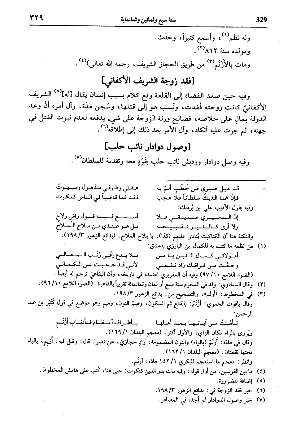 (¬1) من نظمه ما كتب به للكمال بن البارزي بدمشق: أمولائي كمال الدين يا من بلا بدع رقى رتب المعالي وحقّك من فراقك زاد نقصي لأني قد حجبت عن الكمالي (الضوء اللامع 10/ 97) وفيه أن المقريزي اعتمده في تاريخه، وأن البقاعيّ ترجم له أيضا.