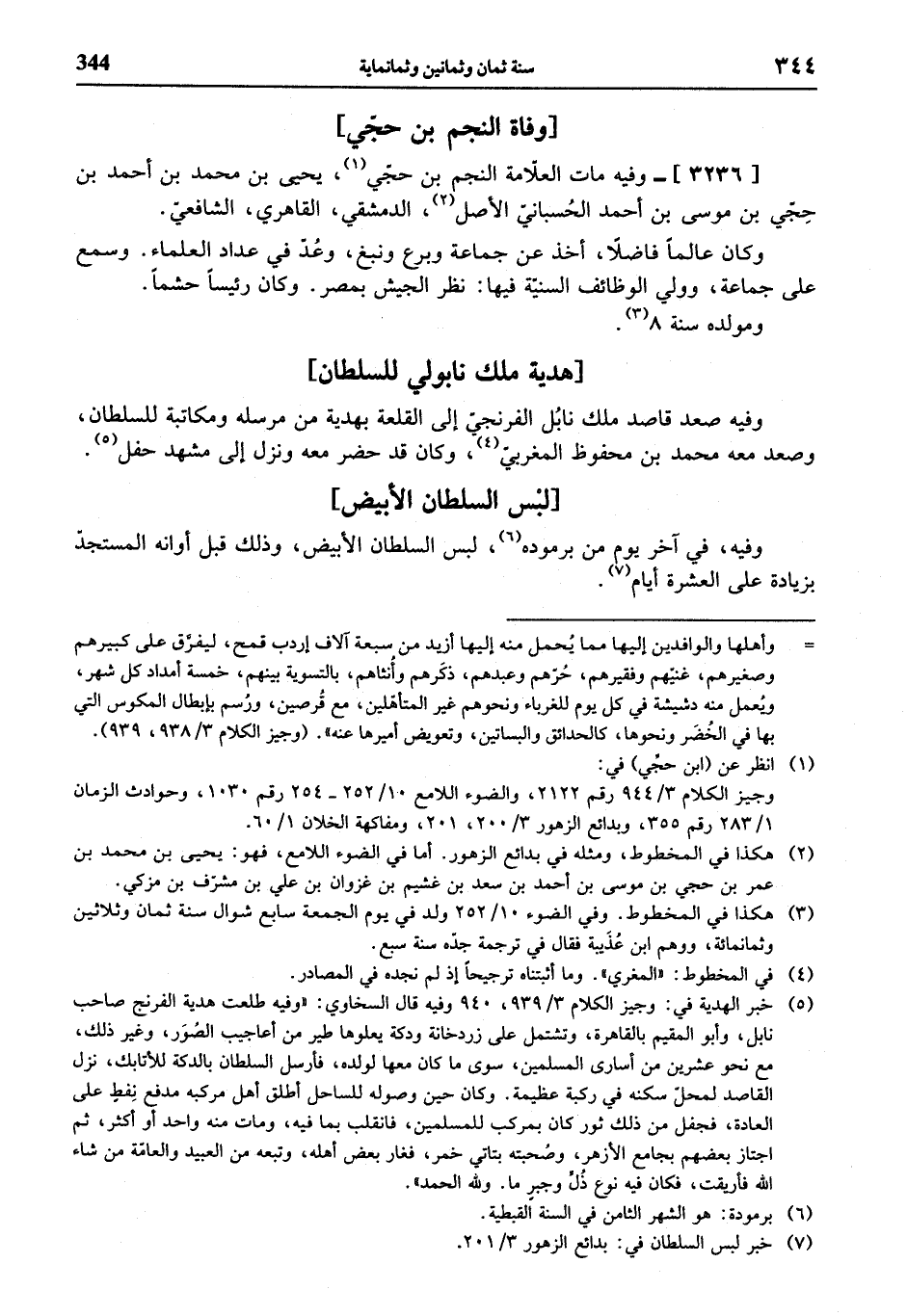 (¬5) خبر الهدية في: وجيز الكلام 3/ 939، 940 وفيه قال السخاوي: «وفيه طلعت هدية الفرنج صاحب نابل، وأبو المقيم بالقاهرة، وتشتمل على زردخانة ودكة يعلوها طير من أعاجيب الصور، وغير ذلك، مع نحو عشرين من أسارى المسلمين، سوى ما كان معها لولده، فأرسل السلطان بالدكة للأتابك، نزل القاصد لمحلّ سكنه في ركبة عظيمة. وكان حين وصوله للساحل أطلق أهل مركبه مدفع نفط على العادة، فجفل من ذلك ثور كان بمركب للمسلمين، فانقلب بما فيه، ومات منه واحد أو أكثر، ثم اجتاز بعضهم بجامع الأزهر، وصحبته بتاتي خمر، فغار بعض أهله، وتبعه من العبيد والعامّة من شاء الله فأريقت، فكان فيه نوع ذلّ وجبر ما. ولله الحمد».