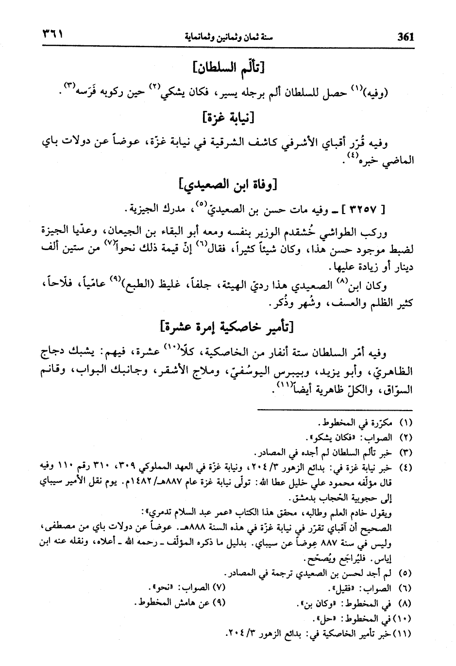 (¬4) خبر نيابة غزة في: بدائع الزهور 3/ 204، ونيابة غزّة في العهد المملوكي 309، 310 رقم 110 وفيه قال مؤلّفه محمود علي خليل عطا الله: تولّى نيابة غزة عام 887 هـ / 1482 م. يوم نقل الأمير سيباي إلى حجوبية الحجاب بدمشق. ويقول خادم العلم وطالبه، محقق هذا الكتاب «عمر عبد السلام تدمري»: الصحيح أن آقباي تقرّر في نيابة غزّة في هذه السنة 888 هـ. عوضا عن دولات باي من مصطفى، وليس في سنة 887 عوضا عن سيباي. بدليل ما ذكره المؤلّف - رحمه الله - أعلاه، ونقله عنه ابن إياس. فليراجع ويصحّح.