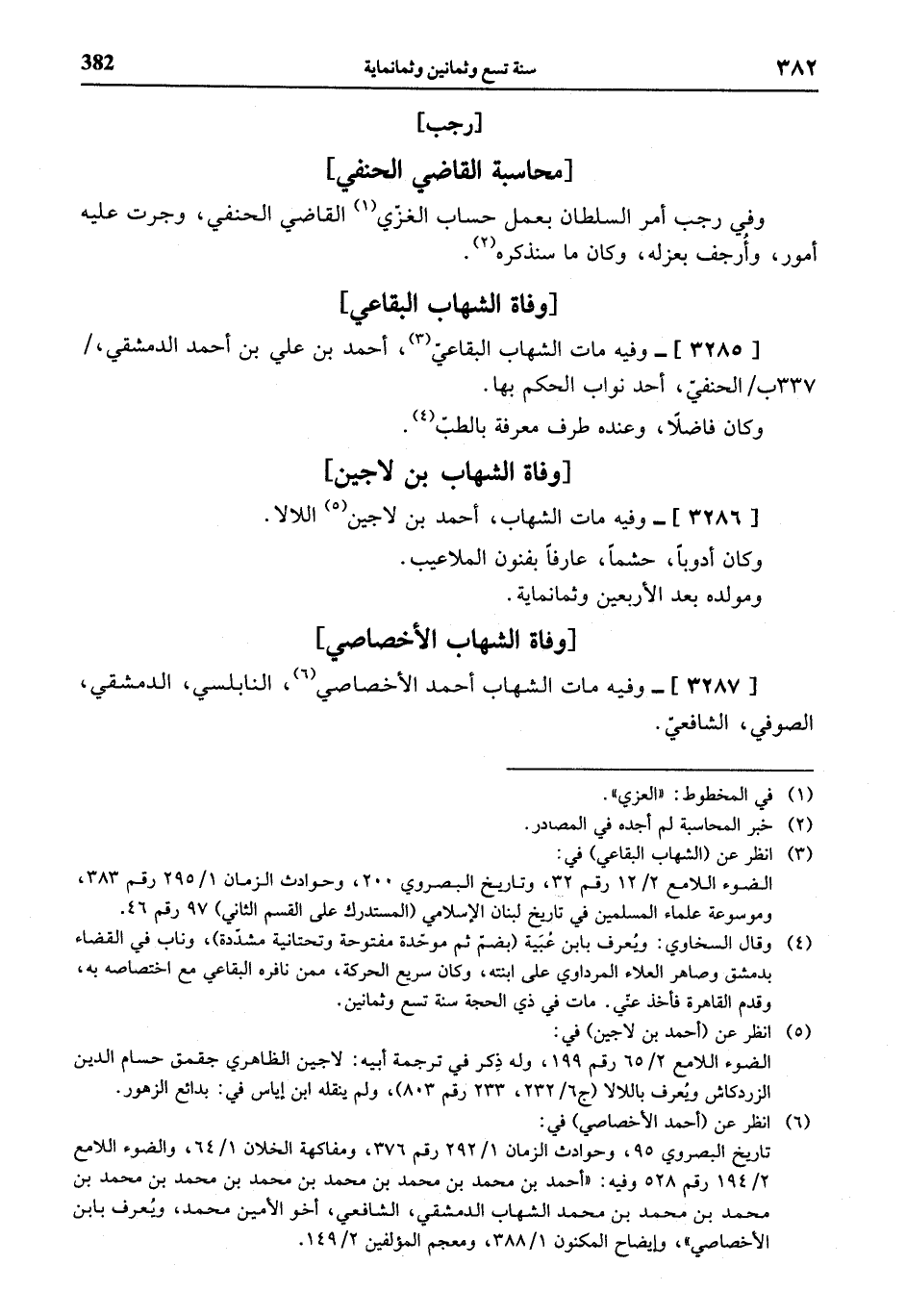 (¬3) انظر عن (الشهاب البقاعي) في: الضوء اللامع 2/ 12 رقم 32، وتاريخ البصروي 200، وحوادث الزمان 1/ 295 رقم 383، وموسوعة علماء المسلمين في تاريخ لبنان الإسلامي (المستدرك على القسم الثاني) 97 رقم 46.