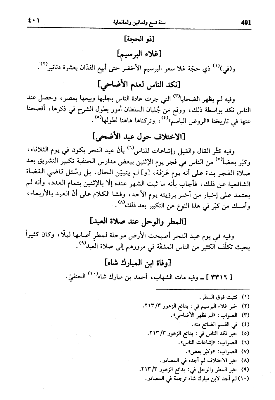 وفيه لم يظهر الضحايا (¬3) التي جرت عادة الناس بجلبها وبيعها بمصر، وحصل عند الناس نكد بواسطة ذلك، ووقع من جلبان السلطان أمور يطول الشرح في ذكرها، أفصحنا عنها في تاريخنا «الروض الباسم» (¬4)، وتركناها هاهنا لطولها (¬5).