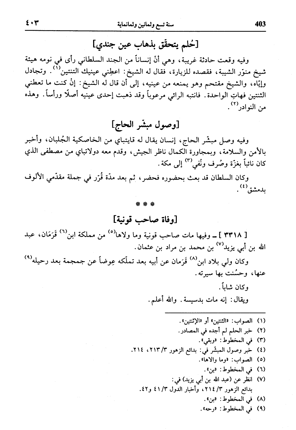 وفيه وقعت حادثة غريبة، وهي أنّ إنسانا من الجند السلطاني رأى في نومه هيئة شيخ منوّر الشيبة، فقصده للزيارة، فقال له الشيخ: اعطني عينيك التنتين (¬1). وتجادل وإيّاه، والشيخ مقتحم وهو يمنعه من عينيه، إلى أن قال له الشيخ: إن كنت ما تعطني الثنتين فهات الواحدة. فانتبه الرائي مرعوبا وقد ذهبت إحدى عينيه أصلا ورأسا. وهذه من النوادر (¬2).