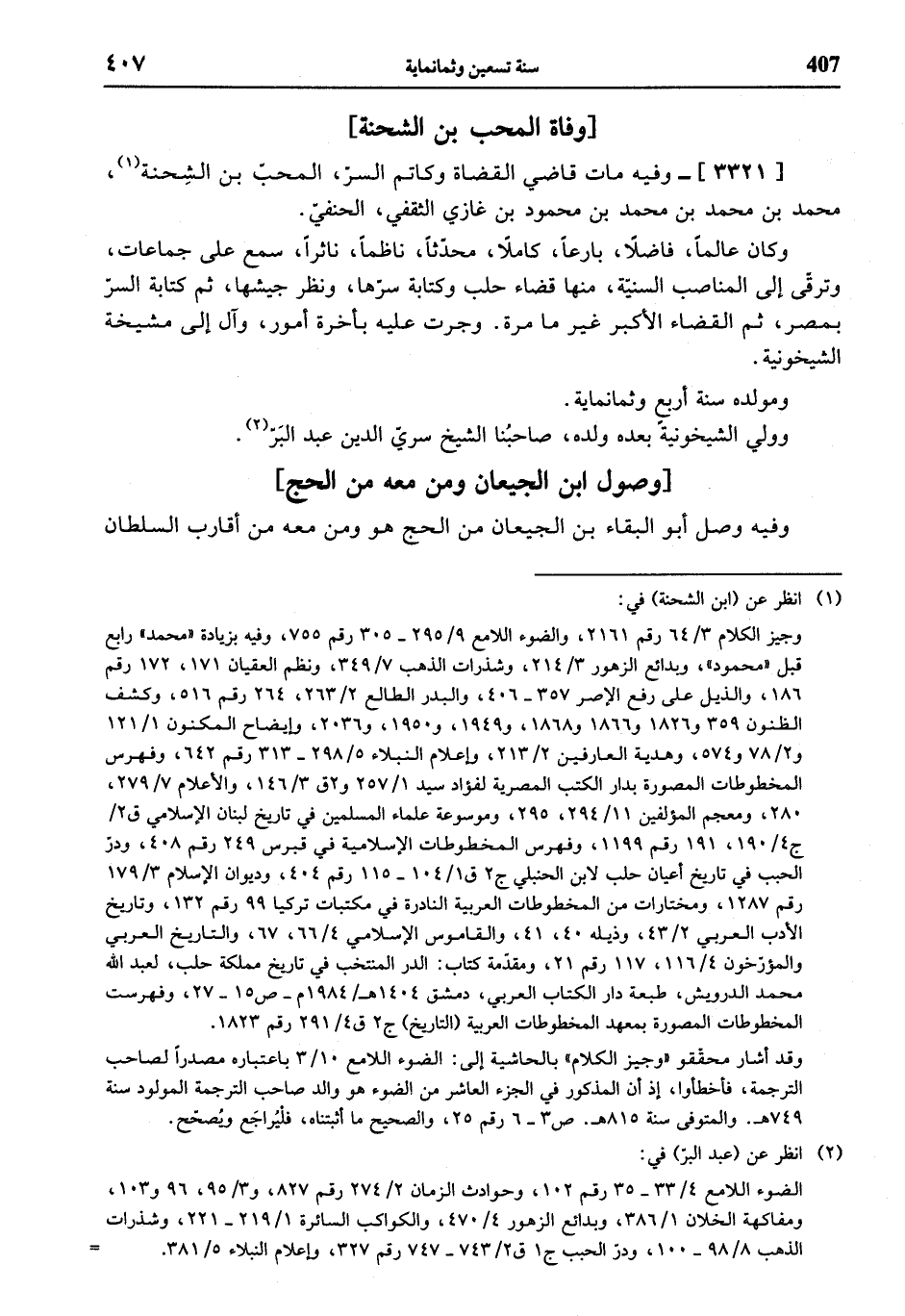(¬1) انظر عن (ابن الشحنة) في: وجيز الكلام 3/ 64 رقم 2161، والضوء اللامع 9/ 295 - 305 رقم 755، وفيه بزيادة «محمد» رابع قبل «محمود»، وبدائع الزهور 3/ 214، وشذرات الذهب 7/ 349، ونظم العقيان 171، 172 رقم 186، والذيل على رفع الإصر 357 - 406، والبدر الطالع 2/ 263، 264 رقم 516، وكشف الظنون 359 و 1826 و 1866 و 1868، و 1949، و 1950، و 2036، وإيضاح المكنون 1/ 121 و 2/ 78 و 574، وهدية العارفين 2/ 213، وإعلام النبلاء 5/ 298 - 313 رقم 642، وفهرس المخطوطات المصورة بدار الكتب المصرية لفؤاد سيد 1/ 257 و 2 ق 3/ 146، والأعلام 7/ 279، 280، ومعجم المؤلفين 11/ 294، 295، وموسوعة علماء المسلمين في تاريخ لبنان الإسلامي ق 2 / ج 4/ 190، 191 رقم 1199، وفهرس المخطوطات الإسلامية في قبرس 249 رقم 408، ودرّ الحبب في تاريخ أعيان حلب لابن الحنبلي ج 2 ق 1/ 104 - 115 رقم 404، وديوان الإسلام 3/ 179 رقم 1287، ومختارات من المخطوطات العربية النادرة في مكتبات تركيا 99 رقم 132، وتاريخ الأدب العربي 2/ 43، وذيله 40، 41، والقاموس الإسلامي 4/ 66، 67، والتاريخ العربي والمؤرّخون 4/ 116، 117 رقم 21، ومقدّمة كتاب: الدر المنتخب في تاريخ مملكة حلب، لعبد الله محمد الدرويش، طبعة دار الكتاب العربي، دمشق 1404 هـ / 1984 م - ص 15 - 27، وفهرست المخطوطات المصورة بمعهد المخطوطات العربية (التاريخ) ج 2 ق 4/ 291 رقم 1823. وقد أشار محقّقو «وجيز الكلام» بالحاشية إلى: الضوء اللامع 10/ 3 باعتباره مصدرا لصاحب الترجمة، فأخطأوا، إذ أن المذكور في الجزء العاشر من الضوء هو والد صاحب الترجمة المولود سنة 749 هـ. والمتوفى سنة 815 هـ. ص 3 - 6 رقم 25، والصحيح ما أثبتناه، فليراجع ويصحّح.