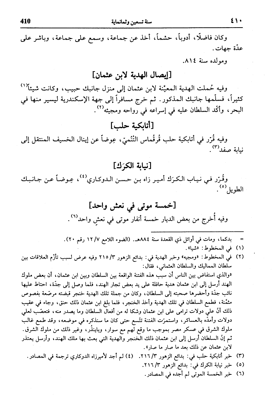 (¬2) في المخطوط: «ومجيه» وخبر الهدية في: بدائع الزهور 3/ 215 وفيه عرض لسبب تأزّم العلاقات بين سلطان المماليك والسلطان العثماني، فقال: «والذي استفاض بين الناس أن سبب هذه الفتنة الواقعة بين السلطان وبين ابن عثمان، أن بعض ملوك الهند أرسل إلى ابن عثمان هدية حافلة على يد بعض تجار الهند، فلما وصل إلى جدّة، احتاط عليها نائب جدّة وأحضرها صحبته إلى السلطان، وكان من جملة تلك الهدية خنجر قبضته مرصّعة بفصوص مثمّنة، فطمع السلطان في تلك الهدية وأخذ الخنجر، فلما بلغ ابن عثمان ذلك حنق، وجاء في عقيب ذلك أنّ علي دولات ترامى على ابن عثمان وشكا له من أفعال السلطان وما يصدر منه، فتعصّب لعلي دولات وأمدّه بالعساكر، واستمرّت الفتنة تتّسع حتى كان ما سنذكره في موضعه، وقد طمع غالب ملوك الشرق في عسكر مصر بموجب ما وقع لهم مع سوار، وباينذر، وغير ذلك من ملوك الشرق. ثم إنّ السلطان أرسل إلى ابن عثمان ذلك الخنجر والهدية التي بعث بها ملك الهند، وأرسل يعتذر لابن عثمان عن ذلك بعد ما صار ما صار».