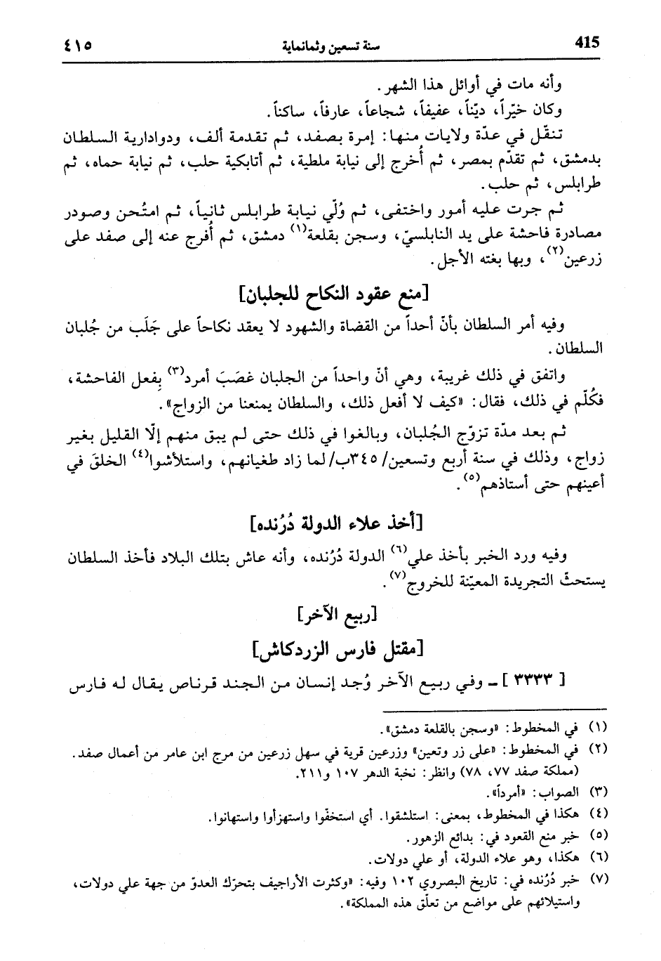 ثم بعد مدّة تزوّج الجلبان، وبالغوا في ذلك حتى لم يبق منهم إلاّ القليل بغير زواج، وذلك في سنة أربع وتسعين / 345 ب / لما زاد طغيانهم، واستلأشوا (¬4) الخلق في أعينهم حتى أستاذهم (¬5).