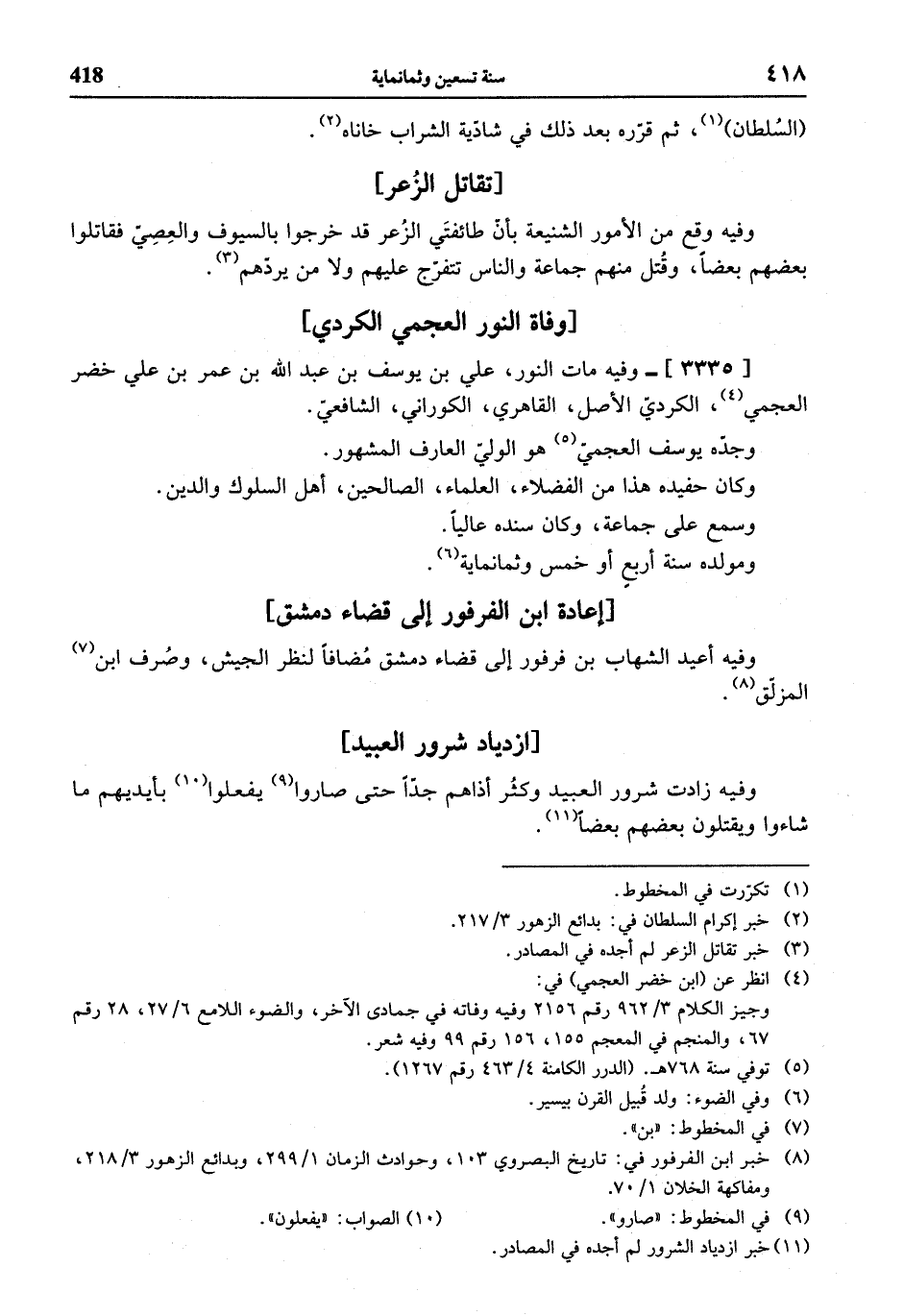 وفيه وقع من الأمور الشنيعة بأنّ طائفتي الزعر قد خرجوا بالسيوف والعصيّ فقاتلوا بعضهم بعضا، وقتل منهم جماعة والناس تتفرّج عليهم ولا من يردّهم (¬3).