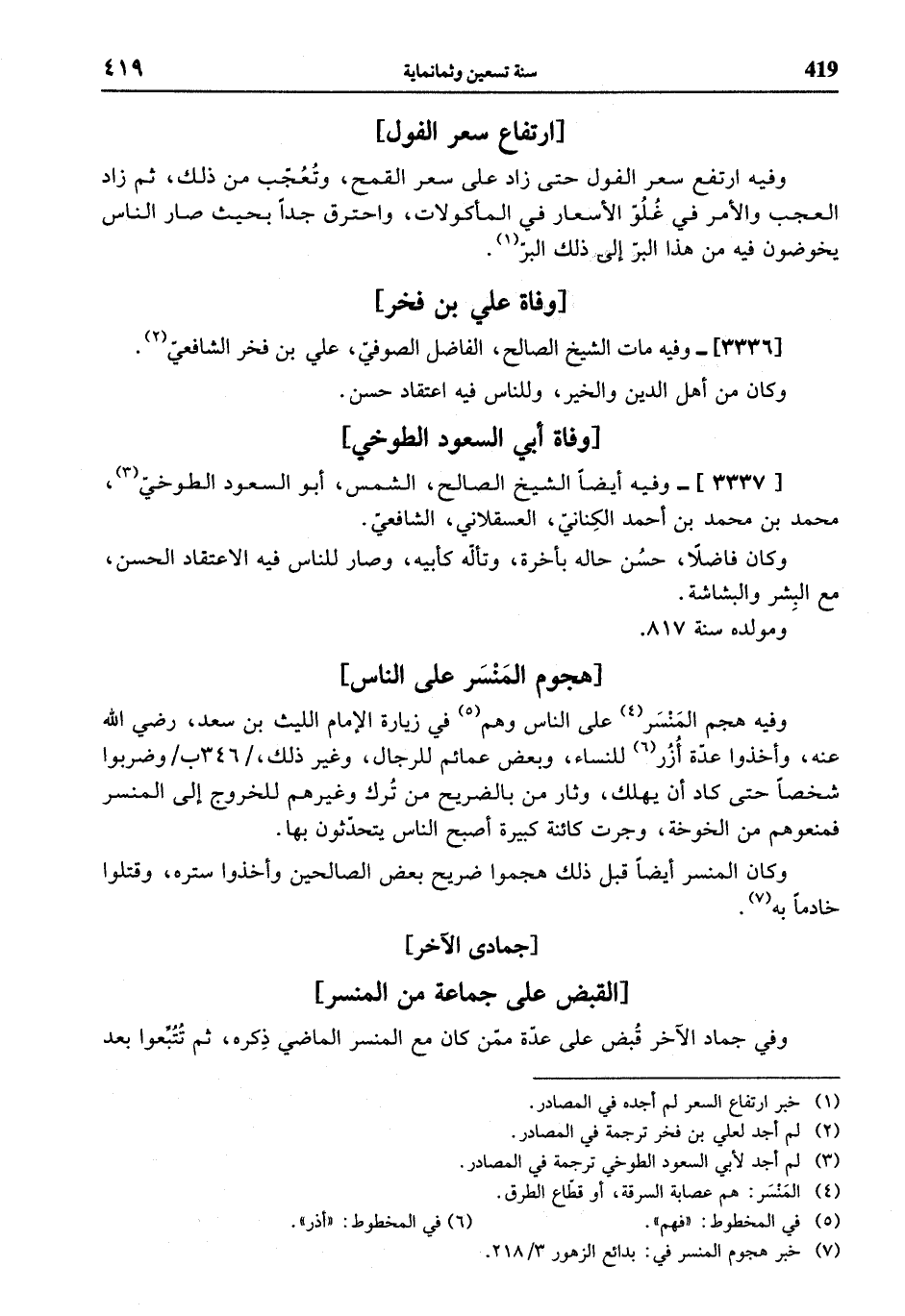 (¬7) خبر هجوم المنسر في: بدائع الزهور 3/ 218.
