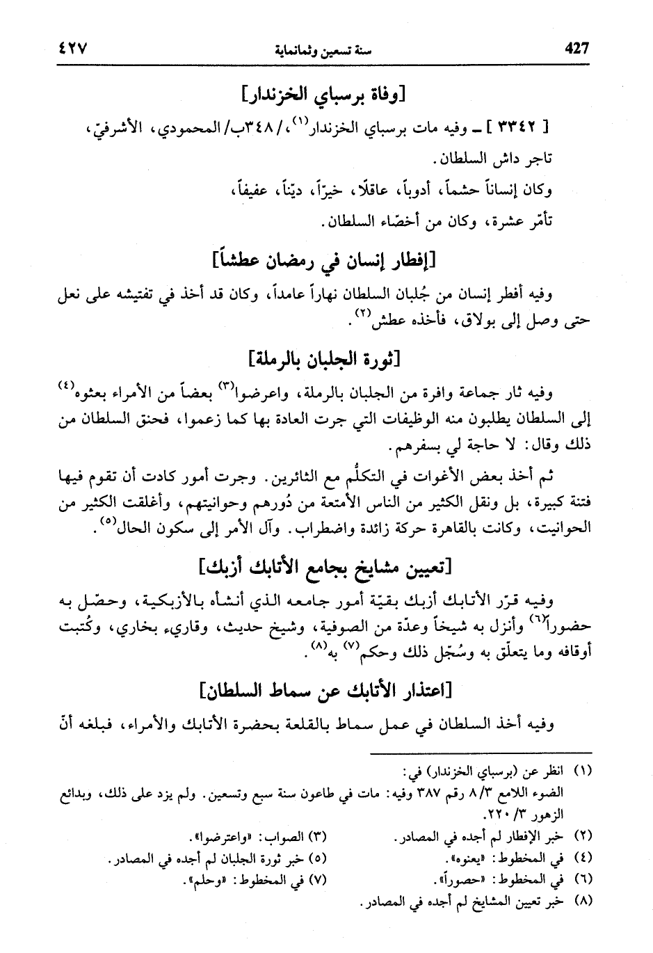 (¬1) انظر عن (برسباي الخزندار) في: الضوء اللامع 3/ 8 رقم 387 وفيه: مات في طاعون سنة سبع وتسعين. ولم يزد على ذلك، وبدائع الزهور 3/ 220.