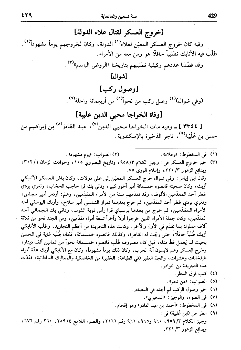 (¬3) خبر خروج العسكر في: وجيز الكلام 3/ 958، وتاريخ البصروي 105، وحوادث الزمان 1/ 302، وبدائع الزهور 3/ 220، وإعلام الورى 75. وقال ابن إياس: وفي شوال خرج العسكر المعيّن إلى علي دولات، وكان باش العسكر الأتابكي أزبك، وكان صحبته قانصوه خمسمائة أمير آخور كبير، وتاني بك قرا حاجب الحجّاب، وتغري بردي ططر أحد المقدّمين الألوف، وقد تقدّمهم ستة من الأمراء المقدّمين، وهم: أزدمر أمير مجلس، وتغري بردي ططر أحد المقدّمين، ثم خرج بعدهما تمراز الشمسي أمير سلاح، وأزبك اليوسفي أحد الأمراء المقدّمين، ثم خرج من بعدها برسباي قرأ رأس نوبة النوب، وتاني بك الجمالي أحد المقدّمين، وكان جملة الأمراء الذين خرجوا أولا وآخرا تسعة أمراء مقدّمين، ومن الجند نحو من ثلاثة آلاف مملوك بما تقدّم في الأول والآخر. وكانت هذه التجريدة من أعظم التجاريد، وطلّب الأتابكي أزبك طلبا حافلا، حتى رجّت له القاهرة، وكذلك قانصوه خمسمائة، فكان طلبه غاية في الحسن بحيث لم يعمل قطّ مثله، قيل كان مصروف طلب قانصوه خمسمائة نحوا من ثمانين ألف دينار، وخرج العسكر وهم لابسون آلة الحرب، وكان ذلك يوما مشهودا، وكان مع الأتابكي أزبك عدّة أمراء طبلخانات وعشرات، والجمّ الغفير (في الطباعة: الخفير) من الخاصكية والمماليك السلطانية، فعدّت هذه التجريدة من النوادر.