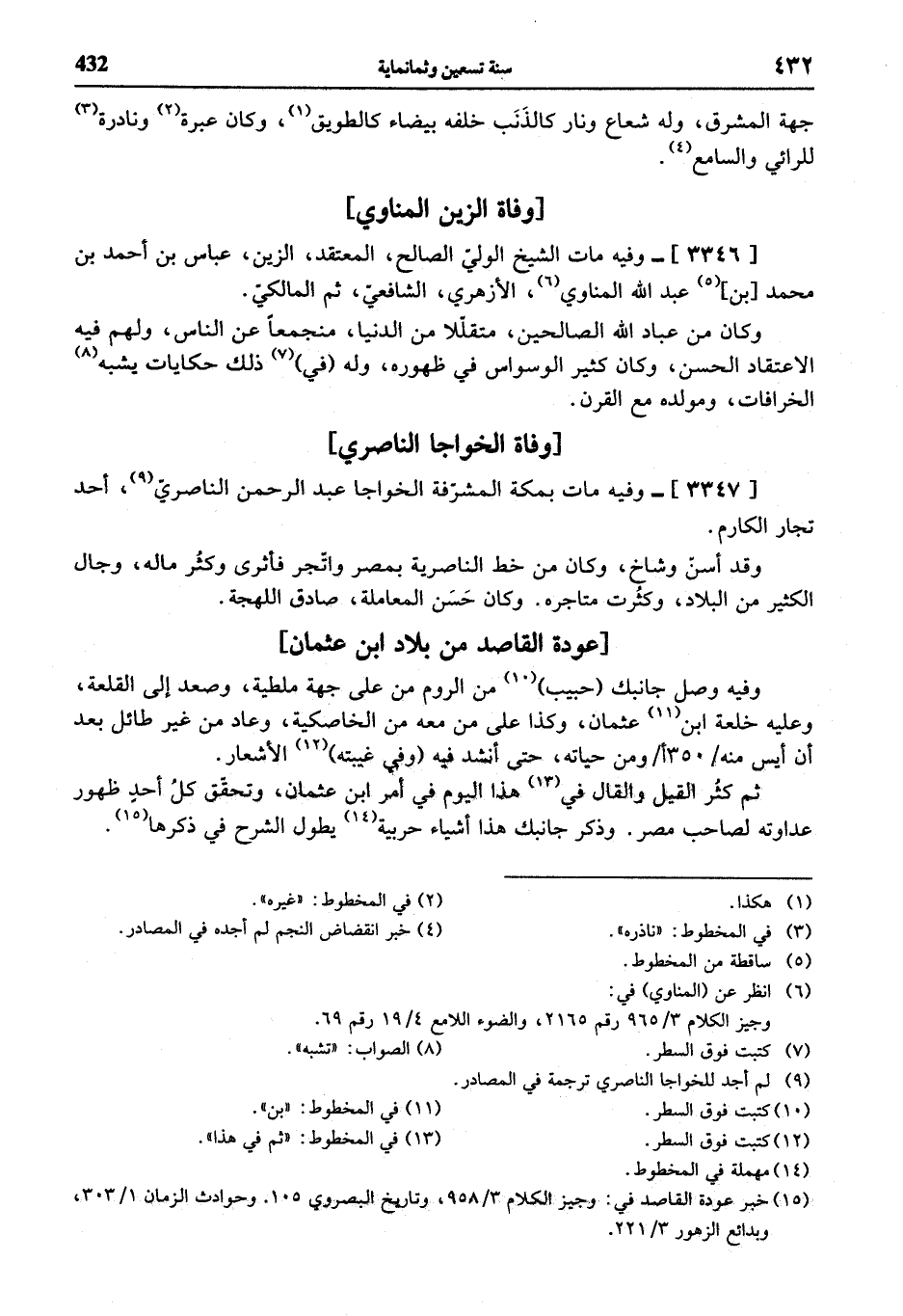 ثم كثر القيل والقال في (¬13) هذا اليوم في أمر ابن عثمان، وتحقّق كل أحد ظهور عداوته لصاحب مصر. وذكر جانبك هذا أشياء حربية (¬14) يطول الشرح في ذكرها (¬15).
