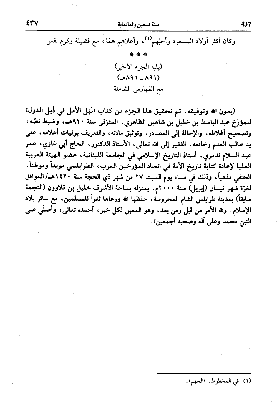(بعون الله وتوفيقه، تم تحقيق هذا الجزء من كتاب «نيل الأمل في ذيل الدول» للمؤرّخ عبد الباسط بن خليل بن شاهين الظاهري، المتوّفى سنة 920 هـ، وضبط نصّه، وتصحيح أغلاطه، والإحالة إلى المصادر، وتوثيق مادته، والتعريف بوفيات أعلامه، على يد طالب العلم وخادمه، الفقير إلى الله تعالى، الأستاذ الدكتور، الحاج أبي غازي، عمر عبد السلام تدمري، أستاذ التاريخ الإسلامي في الجامعة اللبنانية، عضو الهيئة العربية العليا لإعادة كتابة تاريخ الأمة في اتحاد المؤرخين العرب، الطرابلسي مولدا وموطنا، الحنفي مذهبا، وذلك في مساء يوم السبت 27 من شهر ذي الحجة سنة 1420 هـ / الموافق لغرّة شهر نيسان (إبريل) سنة 2000 م. بمنزله بساحة الأشرف خليل بن قلاوون (النجمة سابقا) بمدينة طرابلس الشام المحروسة، حفظها الله ورعاها ثغرا للمسلمين، مع سائر بلاد الإسلام. ولله الأمر من قبل ومن بعد، وهو المعين لكل خير، أحمده تعالى، وأصلّي على النبيّ محمد وعلى آله وصحبه أجمعين».