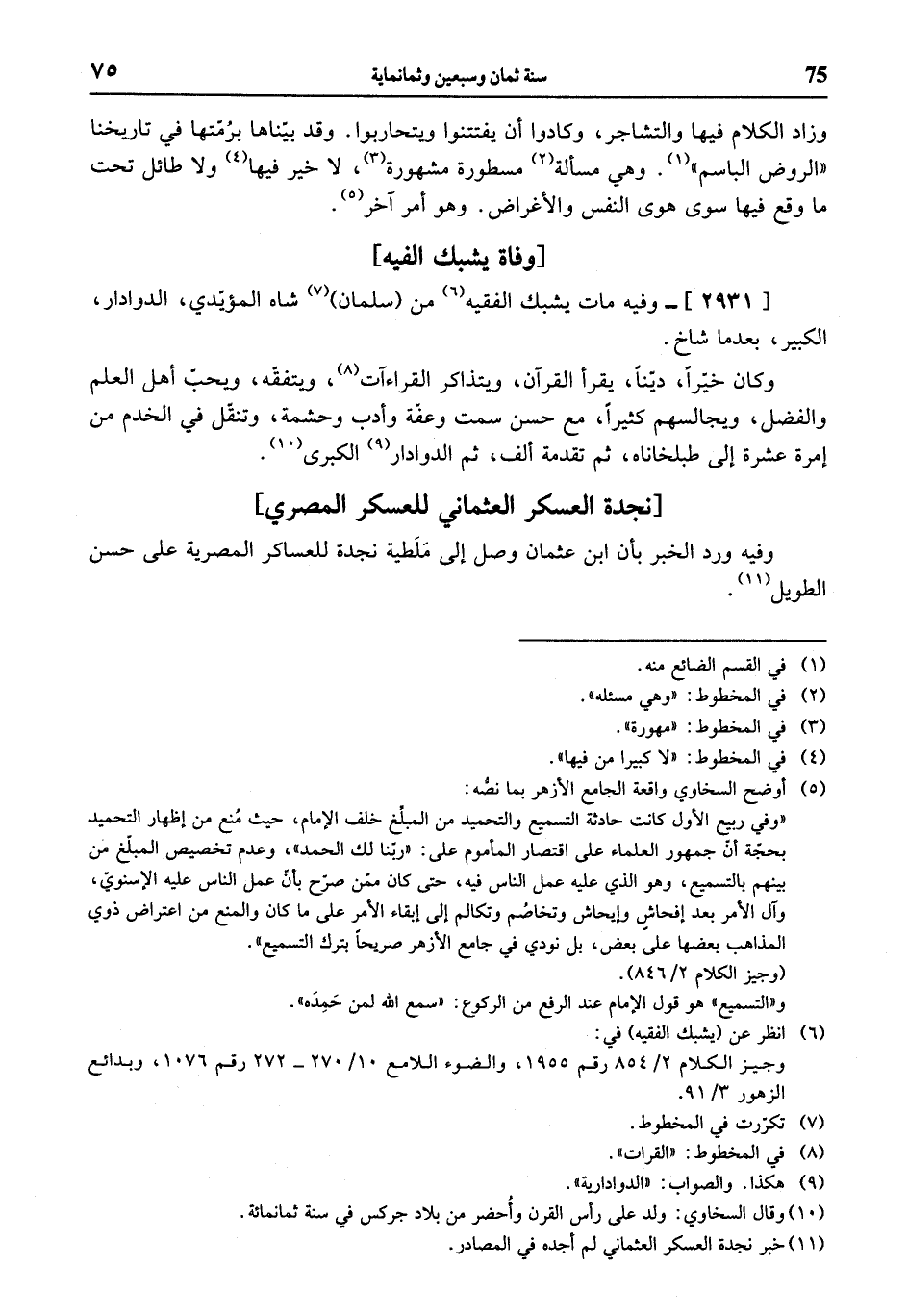 (¬5) أوضح السخاوي واقعة الجامع الأزهر بما نصّه: «وفي ربيع الأول كانت حادثة التسميع والتحميد من المبلّغ خلف الإمام، حيث منع من إظهار التحميد بحجّة أنّ جمهور العلماء على اقتصار المأموم على: «ربّنا لك الحمد»، وعدم تخصيص المبلّغ من بينهم بالتسميع، وهو الذي عليه عمل الناس فيه، حتى كان ممّن صرّح بأنّ عمل الناس عليه الإسنويّ، وآل الأمر بعد إفحاش وإيحاش وتخاصم وتكالم إلى إبقاء الأمر على ما كان والمنع من اعتراض ذوي المذاهب بعضها على بعض، بل نودي في جامع الأزهر صريحا بترك التسميع». (وجيز الكلام 2/ 846). و «التسميع» هو قول الإمام عند الرفع من الركوع: «سمع الله لمن حمده».