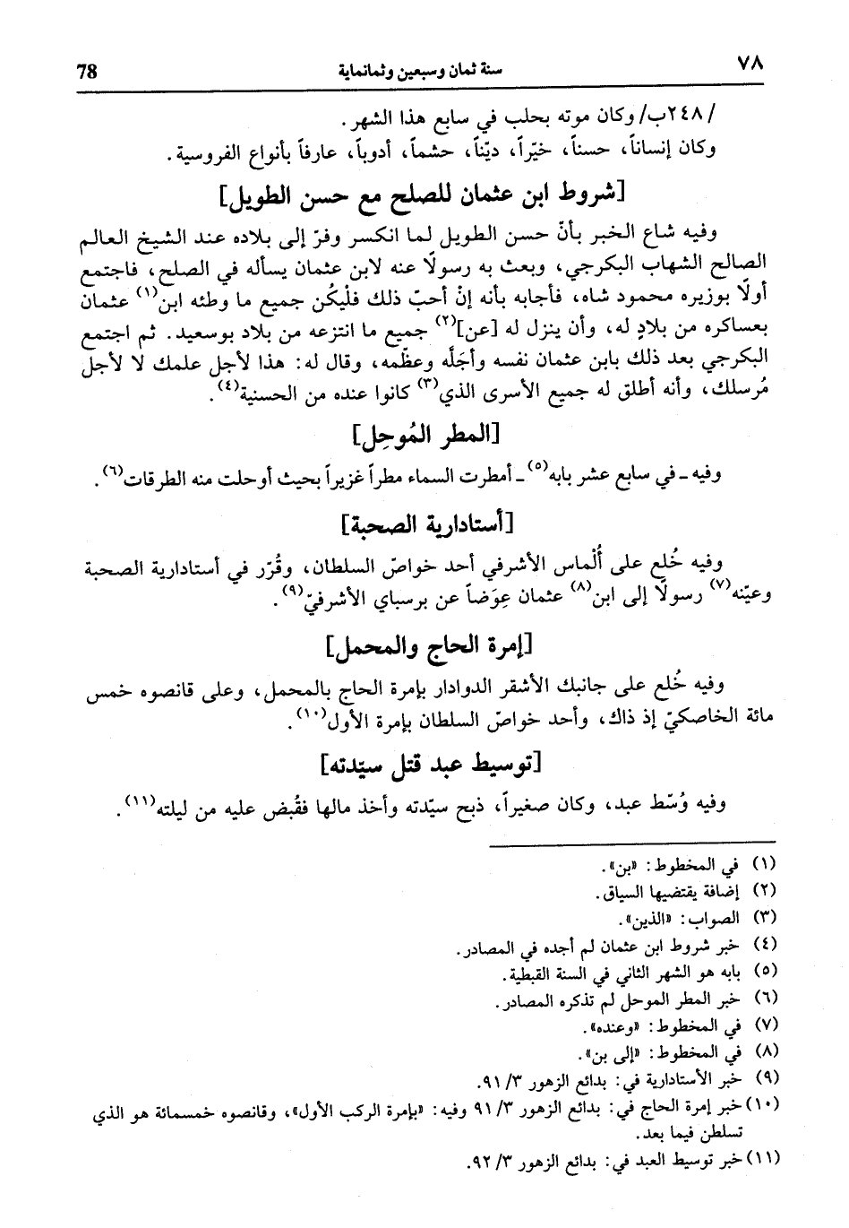 وفيه شاع الخبر بأنّ حسن الطويل لما انكسر وفرّ إلى بلاده عند الشيخ العالم الصالح الشهاب البكرجي، وبعث به رسولا عنه لابن عثمان يسأله في الصلح، فاجتمع أولا بوزيره محمود شاه، فأجابه بأنه إن أحبّ ذلك فليكن جميع ما وطئه ابن (¬1) عثمان بعساكره من بلاد له، وأن ينزل له [عن] (¬2) جميع ما انتزعه من بلاد بو سعيد. ثم اجتمع البكرجي بعد ذلك بابن عثمان نفسه وأجلّه وعظّمه، وقال له: هذا لأجل علمك لا لأجل مرسلك، وأنه أطلق له جميع الأسرى الذي (¬3) كانوا عنده من الحسنية (¬4).