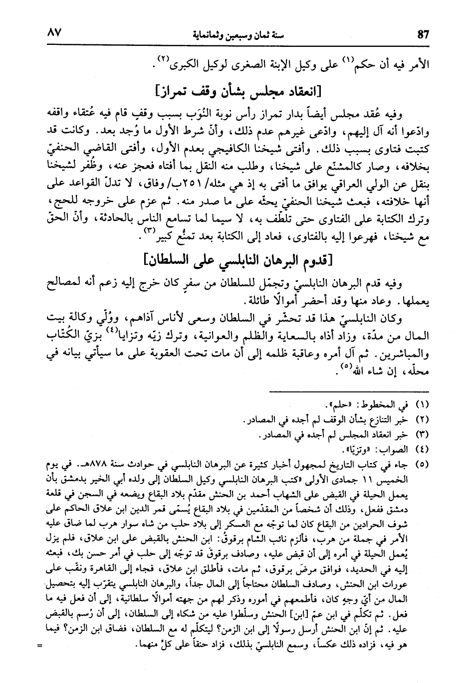 (¬5) جاء في كتاب التاريخ لمجهول أخبار كثيرة عن البرهان النابلسي في حوادث سنة 878 هـ. في يوم الخميس 11 جمادى الأولى «كتب البرهان النابلسي وكيل السلطان إلى ولده أبي الخير بدمشق بأن يعمل الحيلة في القبض على الشهاب أحمد بن الحنش مقدّم بلاد البقاع ويضعه في السجن في قلعة دمشق ففعل، وذلك أن شخصا من المقدّمين في بلاد البقاع يسمّى قمر الدين ابن علاق الحاكم على شوف الحرادين من البقاع كان لما توجّه مع العسكر إلى بلاد حلب من شاه سوار هرب لما ضاق عليه الأمر في جملة من هرب، فألزم نائب الشام برقوق: ابن الحنش بالقبض على ابن علاق، فلم يزل يعمل الحيلة في أمره إلى أن قبض عليه، وصادف برقوق قد توجّه إلى حلب في أمر حسن بك، فبعثه إليه في الحديد، فوافق مرض برقوق، ثم مات، فأطلق ابن علاق، فجاء إلى القاهرة ونقّب على عورات ابن الحنش، وصادف السلطان محتاجا إلى المال جدا، والبرهان النابلسي يتقرّب إليه بتحصيل المال من أيّ وجه كان، فأطمعهم في أموره وذكر لهم من جهته أموالا سلطانية، إلى أن فعل فيه ما فعل. ثم تكلّم في ابن عمّ [ابن] الحنش وسلّطوا عليه من شكاه إلى السلطان، إلى أن رسم بالقبض عليه. ثم إنّ ابن الحنش أرسل رسولا إلى ابن الزمن؟ ليتكلّم له مع السلطان، فضاق ابن الزمن؟ فيما هو فيه، فزاده ذلك عكسا، وسمع النابلسيّ بذلك، فزاد حنقا على كلّ منهما.
