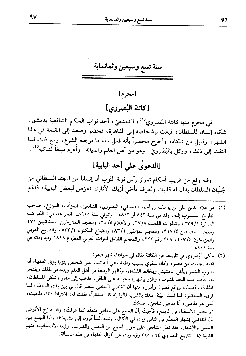 في محرم منها كائنة البصروي (¬1)، الدمشقيّ، أحد نواب الحكم الشافعية بدمشق. شكاه إنسان للسلطان، فبعث بإشخاصه إلى القاهرة، فحضر وصعد إلى القلعة في هذا الشهر، وقابل من شكاه، وأخرج محضرا بأنه فعل معه ما يوجبه الشرع، ومع ذلك فما التفت إلى ذلك، ووكّل بالبصرويّ. وهو من أهل العلم والديانة. وأغرم مبلغا لشاكيه (¬2).
