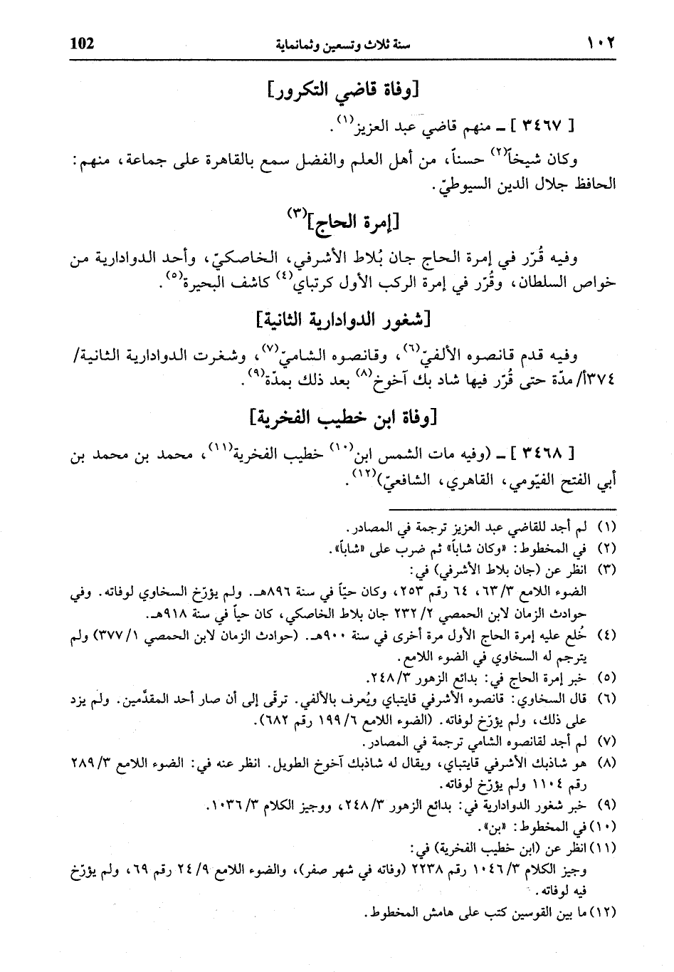 (¬11) انظر عن (ابن خطيب الفخرية) في: وجيز الكلام 3/ 1046 رقم 2238 (وفاته في شهر صفر)، والضوء اللامع 9/ 24 رقم 69، ولم يؤرّخ فيه لوفاته.