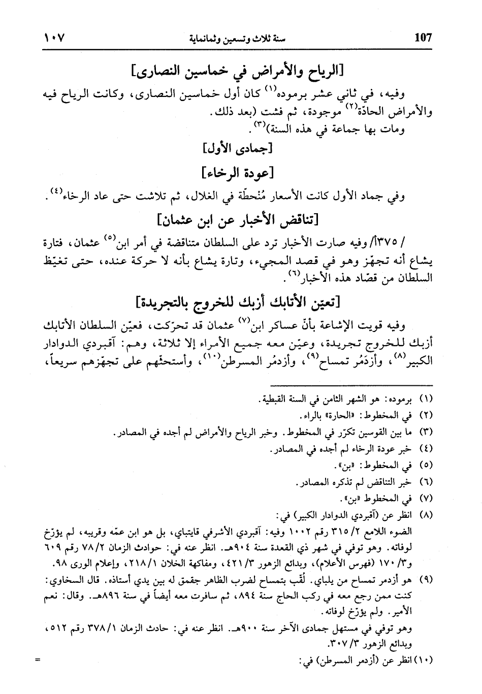 وفيه قويت الإشاعة بأنّ عساكر ابن (¬7) عثمان قد تحرّكت، فعيّن السلطان الأتابك أزبك للخروج تجريدة، وعيّن معه جميع الأمراء إلا ثلاثة، وهم: آقبردي الدوادار الكبير (¬8)، وأزدمر تمساح (¬9)، وأزدمر المسرطن (¬10)، وأستحثّهم على تجهّزهم سريعا،