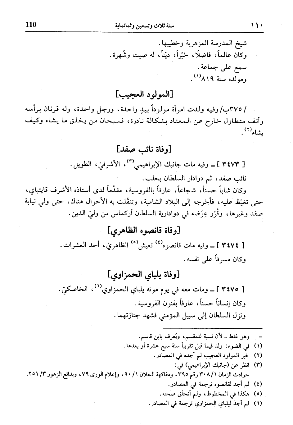 / 375 ب / وفيه ولدت امرأة مولودا بيد واحدة، ورجل واحدة، وله قرنان برأسه وأنف متطاول خارج عن المعتاد بشكالة نادرة، فسبحان من يخلق ما يشاء وكيف يشاء (¬2).