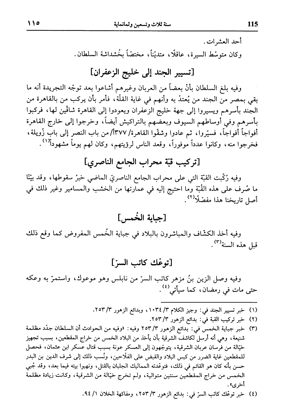 (¬3) خبر جباية الخمس في: بدائع الزهور 3/ 253 وفيه: «وفيه من الحوادث أن السلطان جدّد مظلمة شنيعة، وهي أنه أرسل لكاشف الشرقية بأن يأخذ من البلاد الخمس من خراج المقطعين، بسبب تجهيز خيّالة من فرسان عربان الشرقية، يتوجّهون إلى العسكر عونة بسبب قتال عسكر ابن عثمان، فحصل للمقطعين غاية الضرر من كبس البلاد والقبض على الفلاّحين، ونسب ذلك إلى شرف الدين بن البدر حسن بأنه كان هو القائم في ذلك، فتوعّدته المماليك الجلبان بالقتل، ونهبوا بيته فيما بعد، وقد جبي الخمس من خراج المقطعين سنتين متوالية، ولم تخرج خيّالة من الشرقية، وكانت زيادة مظلمة أخرى».