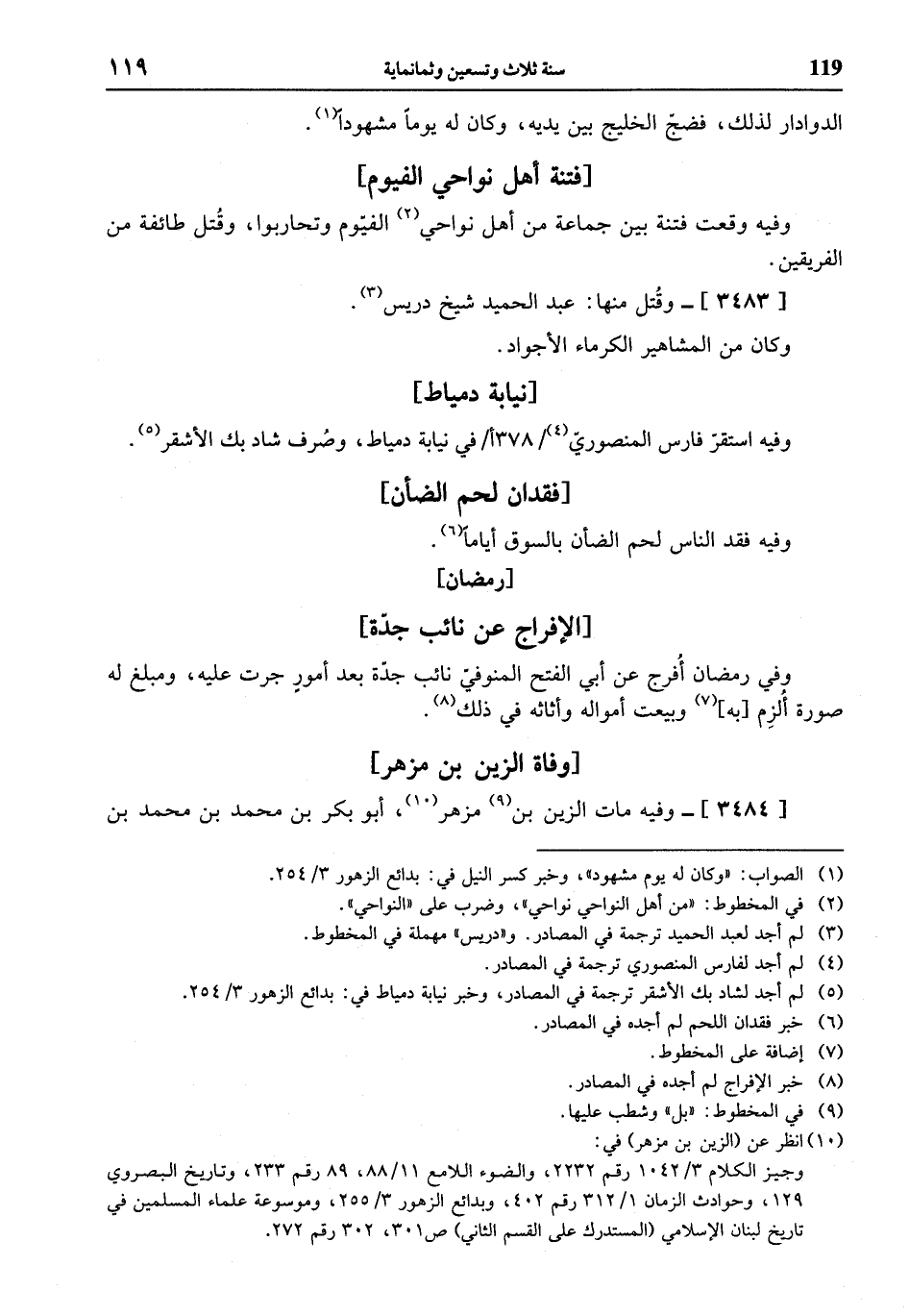 (¬10) انظر عن (الزين بن مزهر) في: وجيز الكلام 3/ 1042 رقم 2232، والضوء اللامع 11/ 88، 89 رقم 233، وتاريخ البصروي 129، وحوادث الزمان 1/ 312 رقم 402، وبدائع الزهور 3/ 255، وموسوعة علماء المسلمين في تاريخ لبنان الإسلامي (المستدرك على القسم الثاني) ص 301، 302 رقم 272.