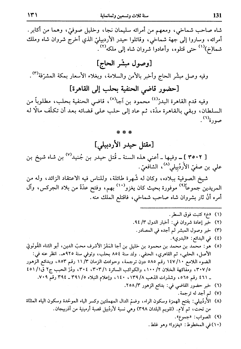 [3502]- وفيها - أعني هذه السنة - قتل حيدر بن جنيد (¬7) بن شاه شيخ بن علي بن صفيّ الأردبيلي (¬8)، الشافعيّ.