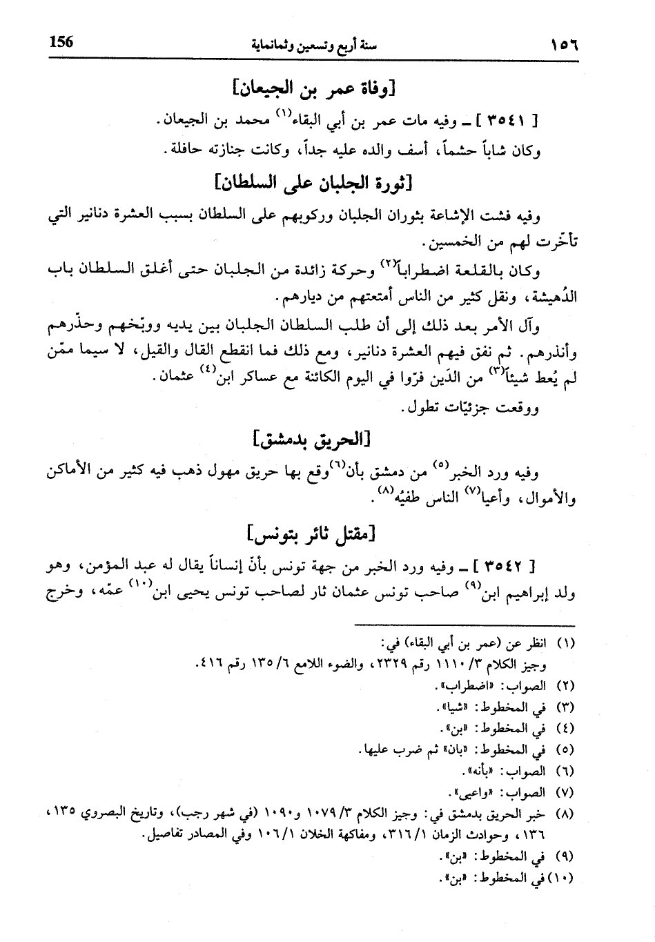 (¬8) خبر الحريق بدمشق في: وجيز الكلام 3/ 1079 و 1090 (في شهر رجب)، وتاريخ البصروي 135، 136، وحوادث الزمان 1/ 316، ومفاكهة الخلان 1/ 106 وفي المصادر تفاصيل.