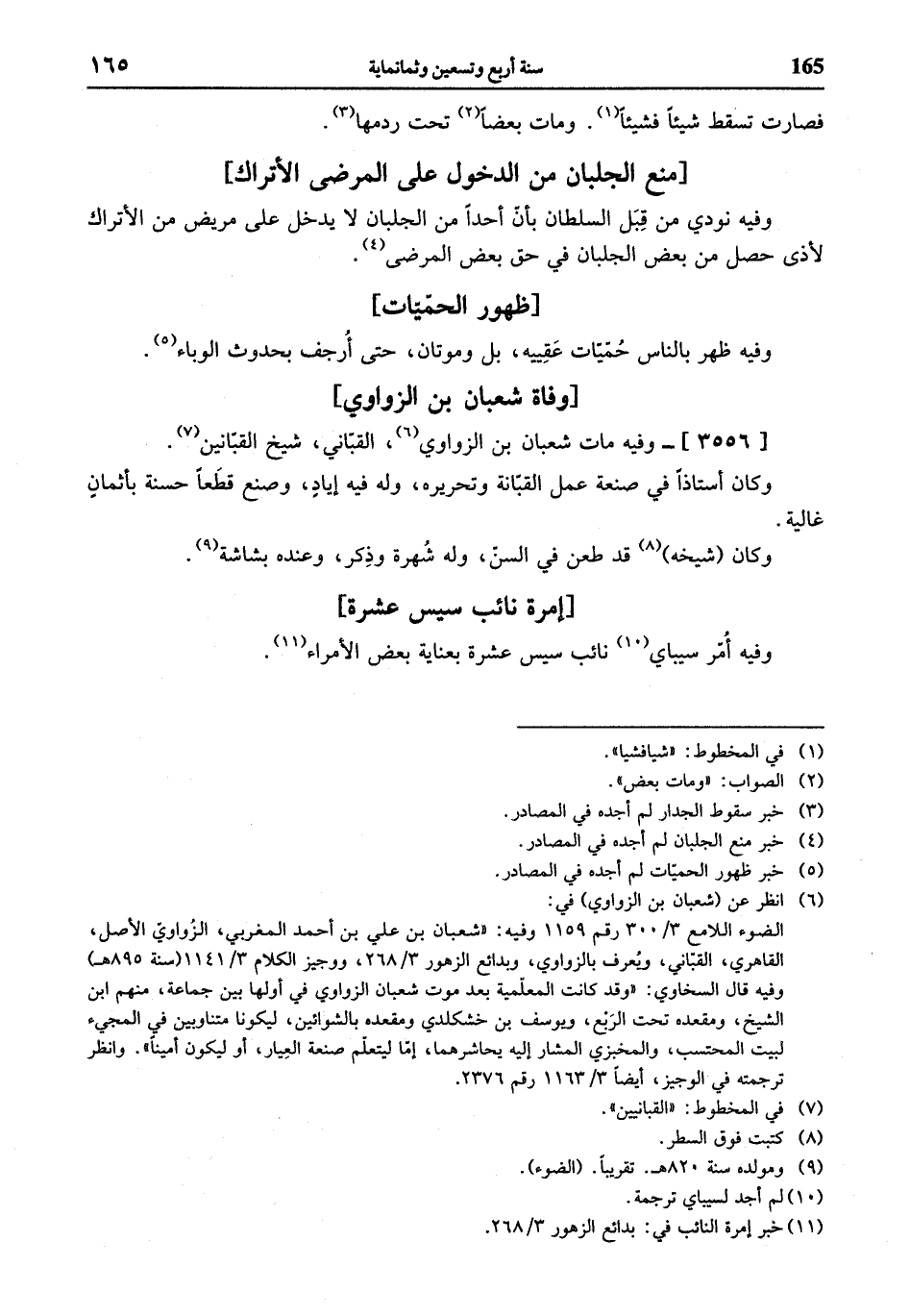 (¬6) انظر عن (شعبان بن الزواوي) في: الضوء اللامع 3/ 300 رقم 1159 وفيه: «شعبان بن علي بن أحمد المغربي، الزواويّ الأصل، القاهريّ، القبّاني، ويعرف بالزواوي، وبدائع الزهور 3/ 268، ووجيز الكلام 3/ 1141 (سنة 895 هـ) وفيه قال السخاوي: «وقد كانت المعلّمية بعد موت شعبان الزواوي في أولها بين جماعة، منهم ابن الشيخ، ومقعده تحت الربع، ويوسف بن خشكلدي ومقعده بالشوائين، ليكونا متناوبين في المجيء لبيت المحتسب، والمخبزي المشار إليه يحاشرهما، إمّا ليتعلّم صنعة العيار، أو ليكون أمينا». وانظر ترجمته في الوجيز، أيضا 3/ 1163 رقم 2376.