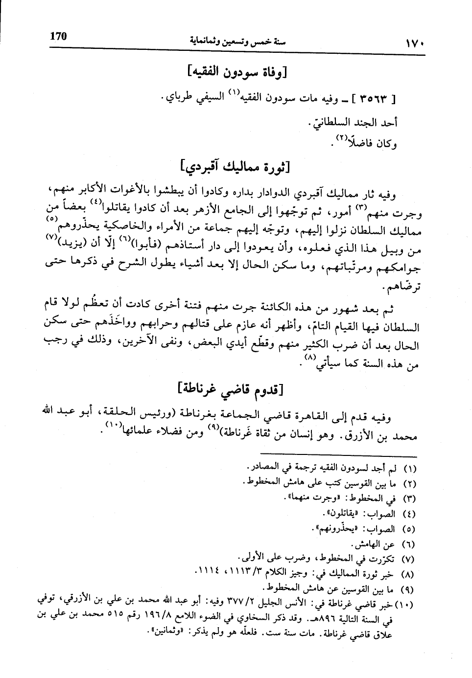 (¬10) خبر قاضي غرناطة في: الأنس الجليل 2/ 377 وفيه: أبو عبد الله محمد بن علي بن الأزرقي، توفي في السنة التالية 896 هـ. وقد ذكر السخاوي في الضوء اللامع 8/ 196 رقم 515 محمد بن علي بن علاق قاضي غرناطة. مات سنة ست. فلعلّه هو ولم يذكر: «وثمانين».