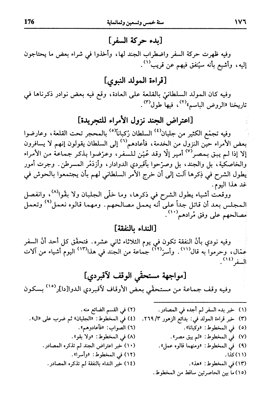 وفيه نودي بأنّ النفقة تكون في يوم الثلاثاء ثاني عشره. فتحقّق كل أحد أنّ السفر عمّال، وحرموا به قال (¬11). وأسرّ (¬12) جماعة من الجند في هذا (¬13) اليوم أشياء من آلات السفر (¬14).