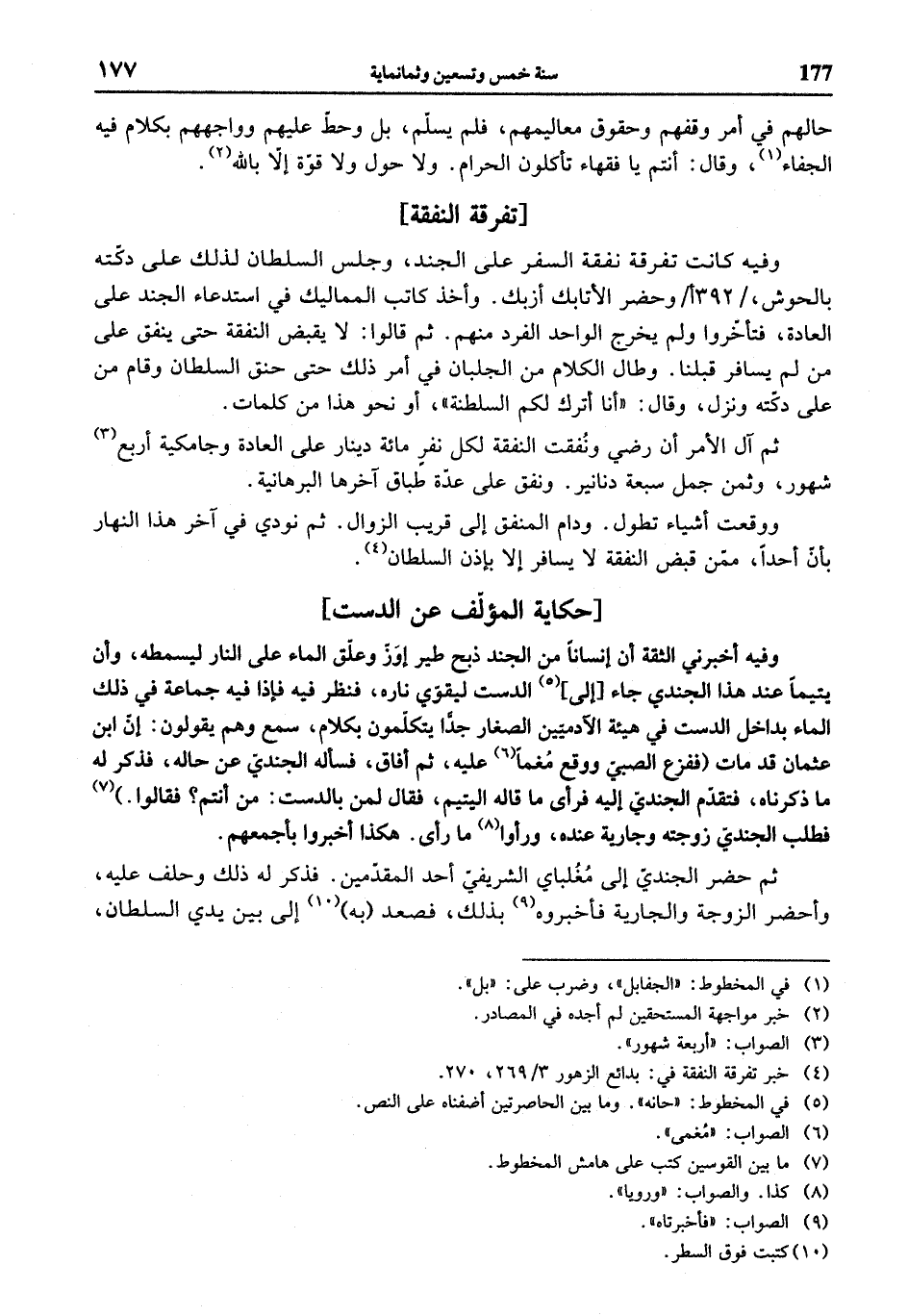 ووقعت أشياء تطول. ودام المنفق إلى قريب الزوال. ثم نودي في آخر هذا النهار بأنّ أحدا، ممّن قبض النفقة لا يسافر إلا بإذن السلطان (¬4).