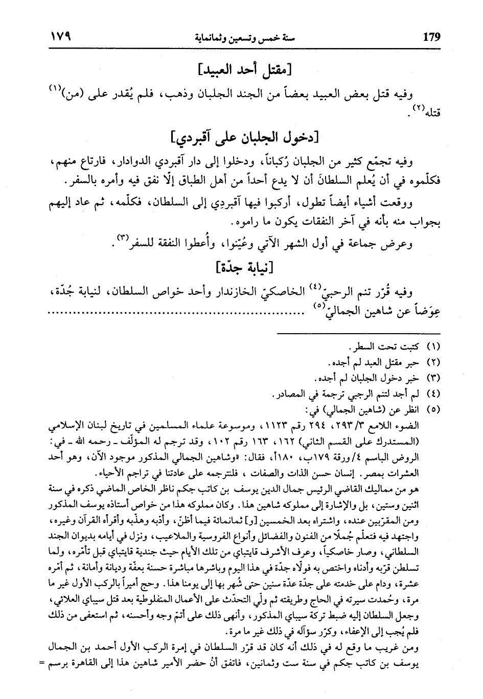 (¬5) انظر عن (شاهين الجمالي) في: الضوء اللامع 3/ 293، 294 رقم 1123، وموسوعة علماء المسلمين في تاريخ لبنان الإسلامي (المستدرك على القسم الثاني) 162، 163 رقم 102، وقد ترجم له المؤلّف - رحمه الله - في: الروض الباسم 4 / ورقة 179 ب، 180 أ، فقال: «وشاهين الجمالي المذكور موجود الآن، وهو أحد العشرات بمصر. إنسان حسن الذات والصفات، فلنترجمه على عادتنا في تراجم الأحياء. هو من مماليك القاضي الرئيس جمال الدين يوسف بن كاتب جكم ناظر الخاص الماضي ذكره في سنة اثنين وستين، بل والإشارة إلى مملوكه شاهين هذا. وكان مملوكه هذا من خواص أستاذه يوسف المذكور ومن المقرّبين عنده، واشتراه بعد الخمسين [و] ثمانمائة فيما أظنّ، وأدّبه وهذّبه وأقرأه القرآن وغيره، واجتهد فيه فتعلّم جملاّ من الفنون والفضائل وأنواع الفروسية والملاعيب، ونزل في أيامه بديوان الجند السلطاني، وصار خاصكيا، وعرف الأشرف قايتباي من تلك الأيام حيث جندية قايتباي قبل تأمّره، ولما تسلطن قرّبه وأدناه واختص به فولاّه جدّة في هذا اليوم وباشرها مباشرة حسنة بعفّة وديانة وأمانة، ثم أمّره عشرة، ودام على خدمته على جدّة عدّة سنين حتى شهر بها إلى يومنا هذا. وحج أميرا بالركب الأول غير ما مرة، وحمدت سيرته في الحاج وطريقته ثم ولّي التحدّث على الأعمال المنفلوطية بعد قتل سيباي العلائي، وجعل السلطان إليه ضبط تركة سيباي المذكور، وأنهى ذلك على أتمّ وجه وأحسنه، ثم استعفى من ذلك فلم يجب إلى الإعفاء، وكرّر سؤآله في ذلك غير ما مرة. ومن غريب ما وقع له في ذلك أنه كان قد قرّر السلطان في إمرة الركب الأول أحمد بن الجمال يوسف بن كاتب جكم في سنة ست وثمانين، فاتفق أن حضر الأمير شاهين هذا إلى القاهرة برسم =