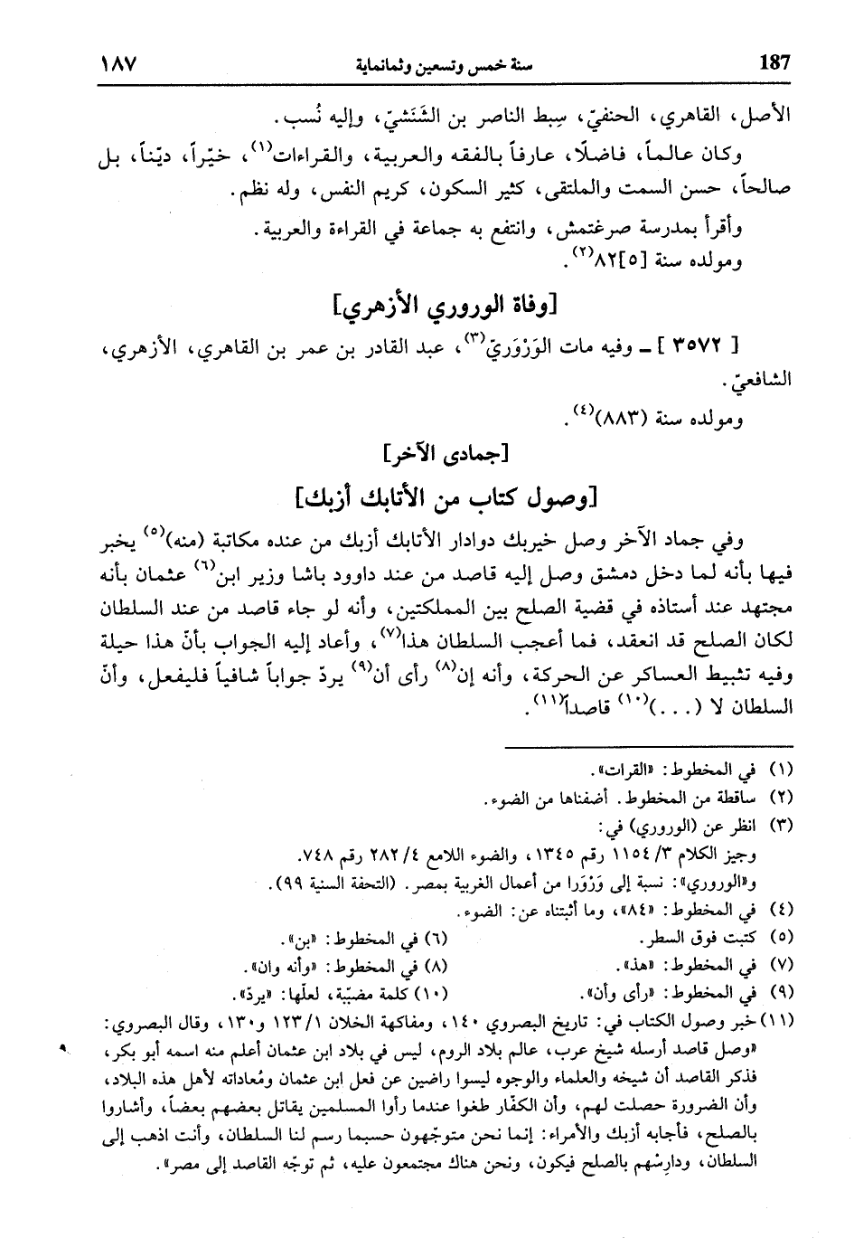 (¬11) خبر وصول الكتاب في: تاريخ البصروي 140، ومفاكهة الخلان 1/ 123 و 130، وقال البصروي: «وصل قاصد أرسله شيخ عرب، عالم بلاد الروم، ليس في بلاد ابن عثمان أعلم منه اسمه أبو بكر، فذكر القاصد أن شيخه والعلماء والوجوه ليسوا راضين عن فعل ابن عثمان ومعاداته لأهل هذه البلاد، وأن الضرورة حصلت لهم، وأن الكفّار طغوا عند ما رأوا المسلمين يقاتل بعضهم بعضا، وأشاروا بالصلح، فأجابه أزبك والأمراء: إنما نحن متوجّهون حسبما رسم لنا السلطان، وأنت الذهب إلى السلطان، ودارسهم بالصلح فيكون، ونحن هناك مجتمعون عليه، ثم توجّه القاصد إلى مصر».
