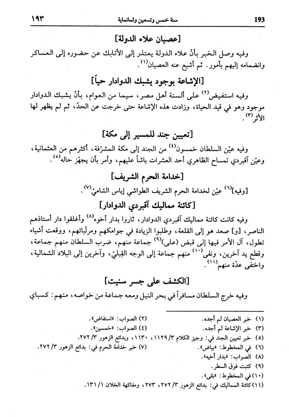 (¬11) كائنة المماليك في: بدائع الزهور 3/ 272، 273، ومفاكهة الخلان 1/ 131.