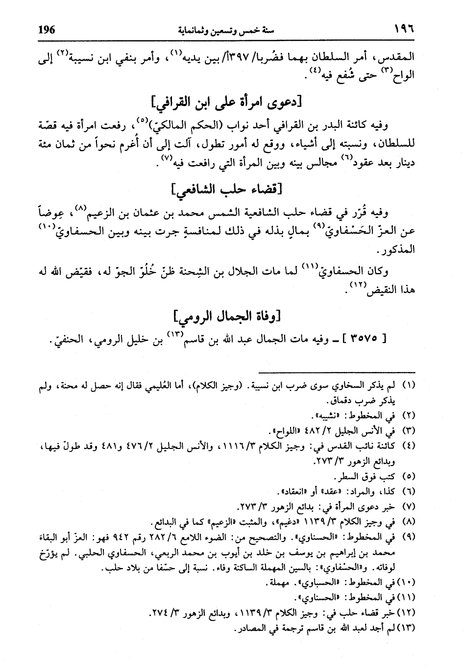 (¬1) لم يذكر السخاوي سوى ضرب ابن نسيبة. (وجيز الكلام)، أما العليمي فقال إنه حصل له محنة، ولم يذكر ضرب دقماق.