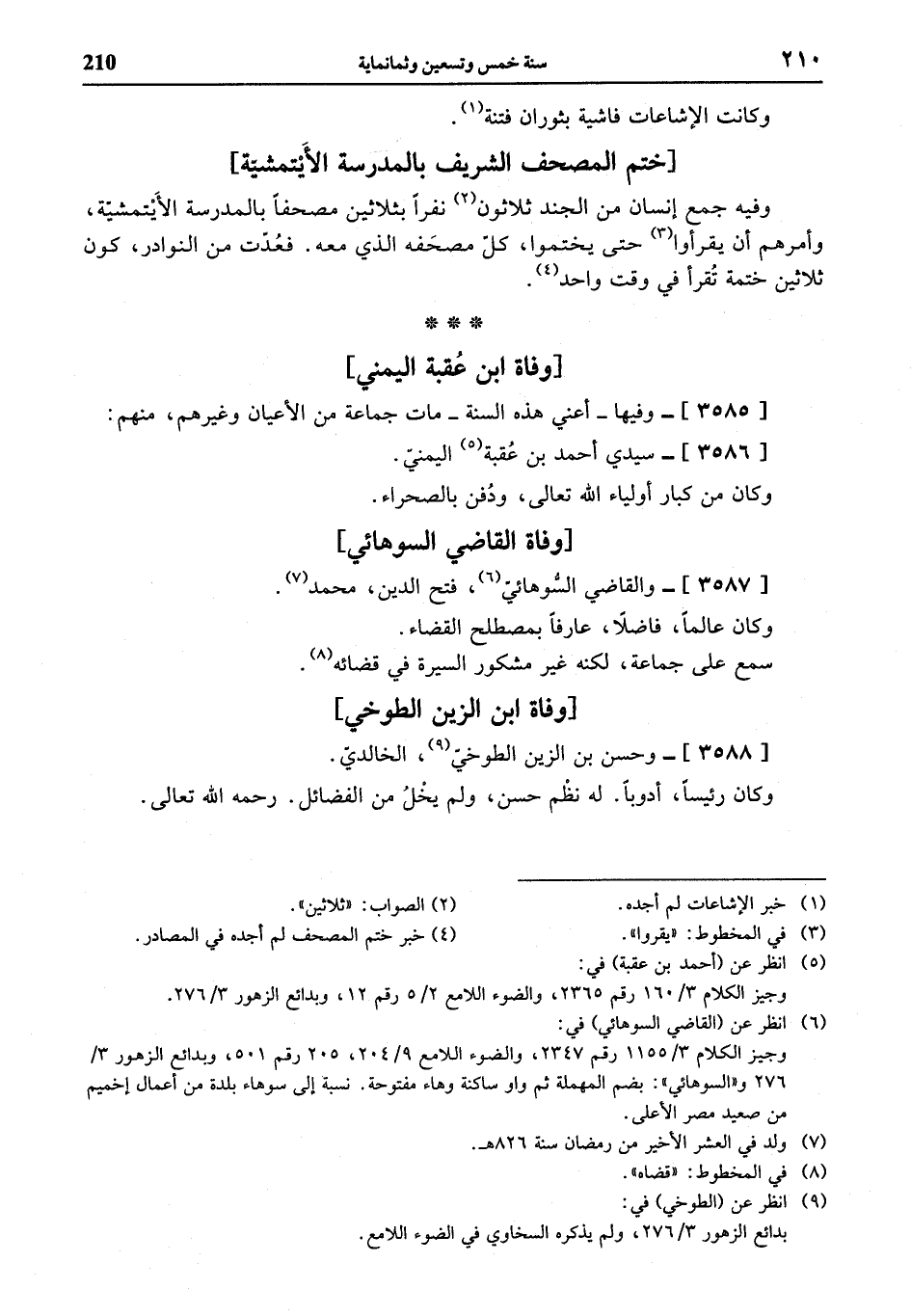 (¬6) انظر عن (القاضي السوهائي) في: وجيز الكلام 3/ 1155 رقم 2347، والضوء اللامع 9/ 204، 205 رقم 501، وبدائع الزهور 3/ 276 و «السوهائي»: بضم المهملة ثم واو ساكنة وهاء مفتوحة. نسبة إلى سوهاء بلدة من أعمال إخميم من صعيد مصر الأعلى.