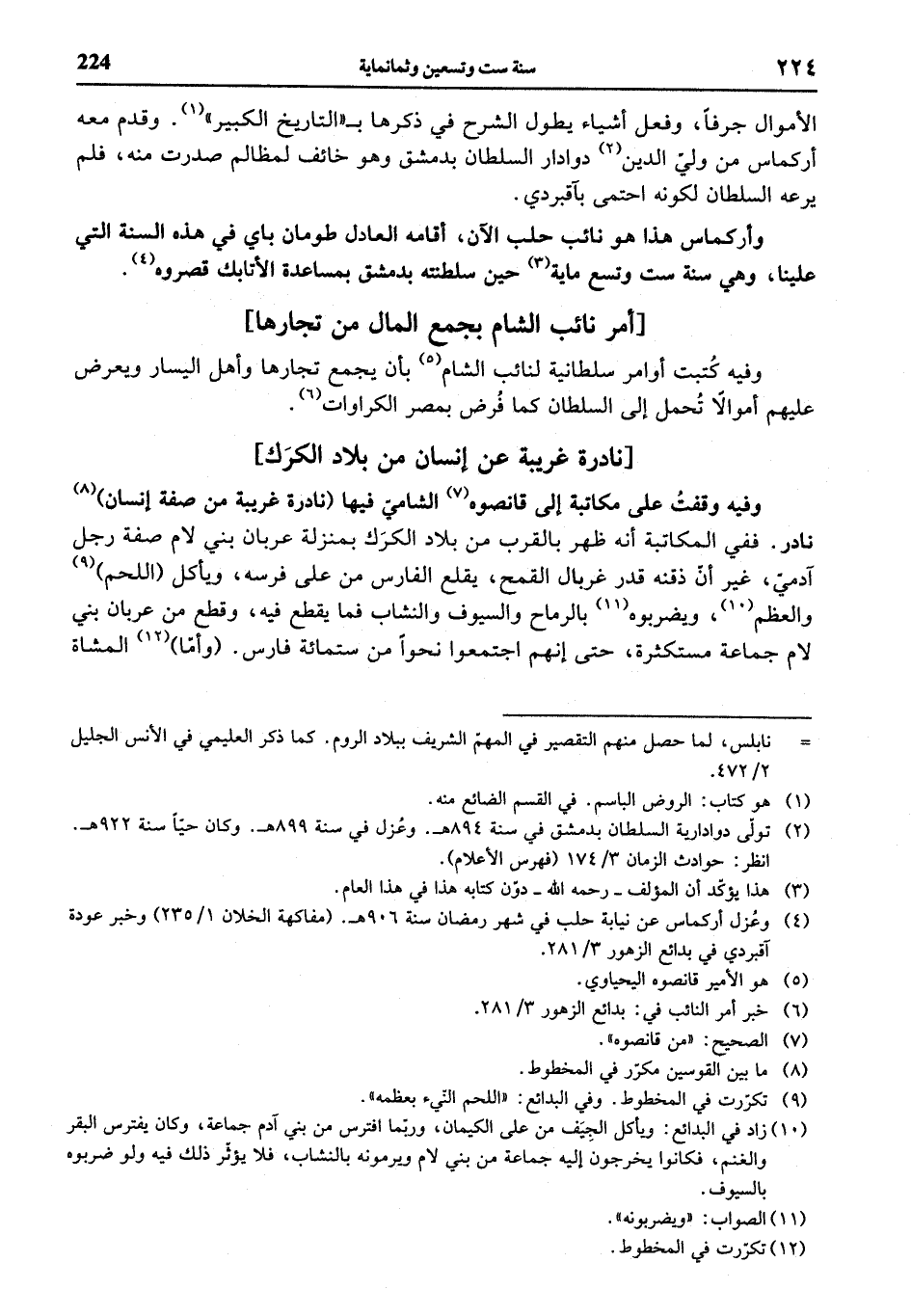 وفيه وقفت على مكاتبة إلى قانصوه (¬7) الشاميّ فيها (نادرة غريبة من صفة إنسان) (¬8) نادر. ففي المكاتبة أنه ظهر بالقرب من بلاد الكرك بمنزلة عربان بني لام صفة رجل آدميّ، غير أنّ ذقنه قدر غربال القمح، يقلع الفارس من على فرسه، ويأكل (اللحم) (¬9) والعظم (¬10)، ويضربوه (¬11) بالرماح والسيوف والنشاب فما يقطع فيه، وقطع من عربان بني لام جماعة مستكثرة، حتى إنهم اجتمعوا نحوا من ستمائة فارس. (وأمّا) (¬12) المشاة