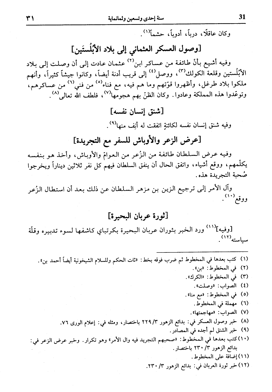 (¬12) خبر ثورة العربان في: بدائع الزهور 3/ 230.
