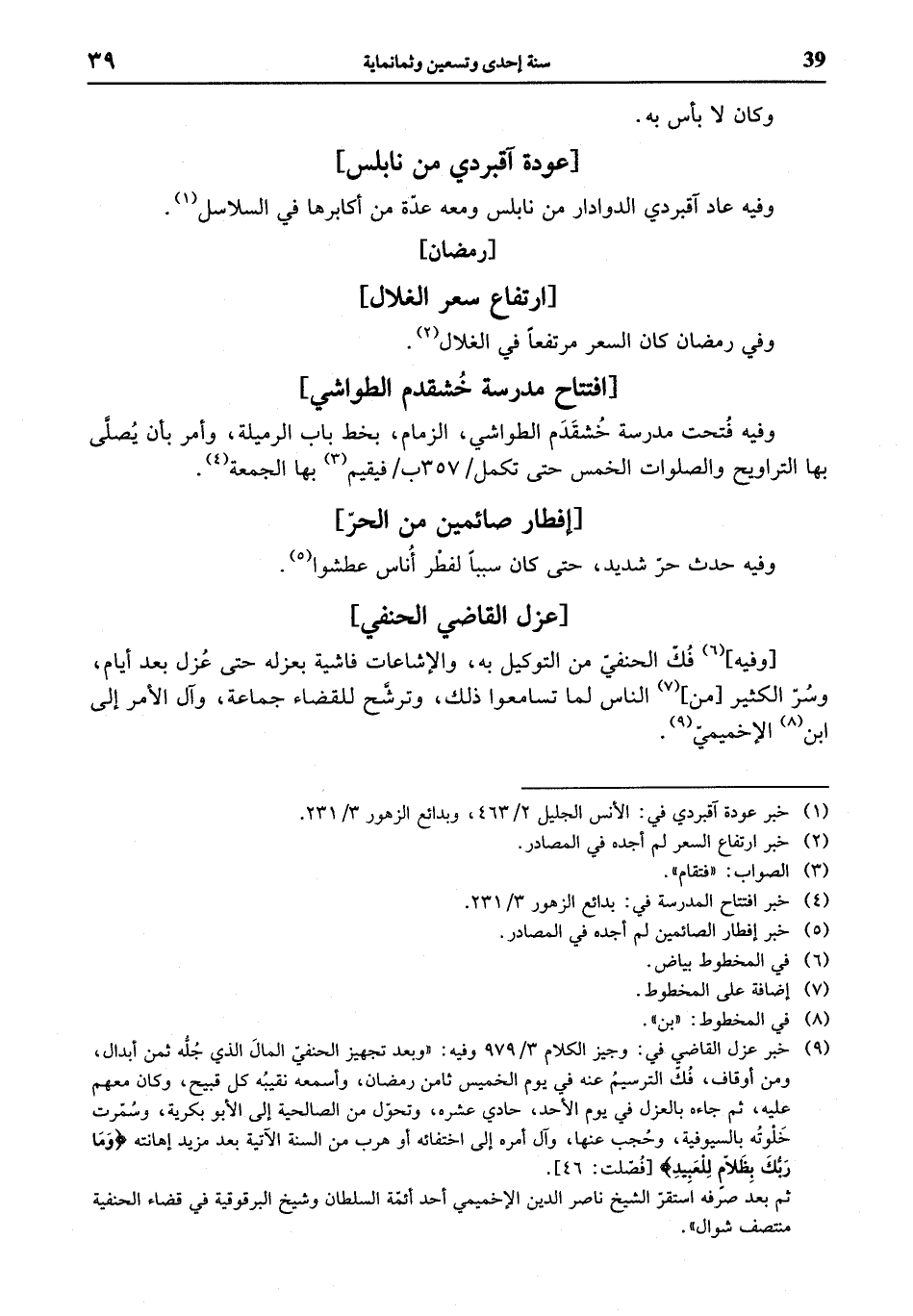 (¬9) خبر عزل القاضي في: وجيز الكلام 3/ 979 وفيه: «وبعد تجهيز الحنفيّ المال الذي جلّه ثمن أبدال، ومن أوقاف، فكّ الترسيم عنه في يوم الخميس ثامن رمضان، وأسمعه نقيبه كل قبيح، وكان معهم عليه، ثم جاءه بالعزل في يوم الأحد، حادي عشره، وتحوّل من الصالحية إلى الأبو بكرية، وسمّرت خلوته بالسيوفية، وحجب عنها، وآل أمره إلى اختفائه أو هرب من السنة الآتية بعد مزيد إهانته وَما رَبُّكَ بِظَلاّمٍ لِلْعَبِيدِ [فصّلت: 46]. ثم بعد صرّفه استقرّ الشيخ ناصر الدين الإخميمي أحد أئمّة السلطان وشيخ البرقوقية في قضاء الحنفية منتصف شوال».