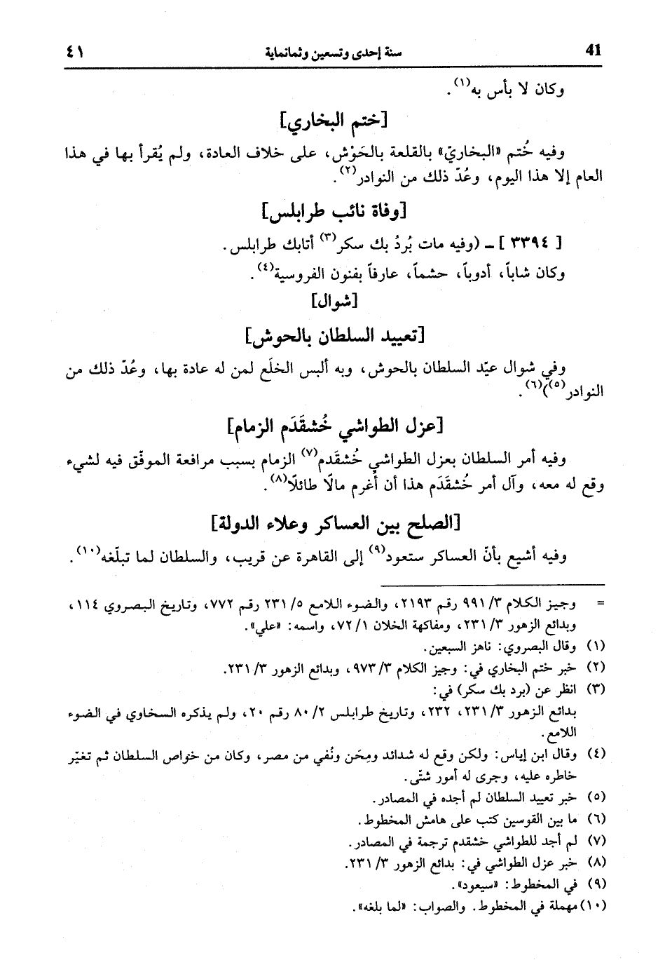(¬3) انظر عن (برد بك سكر) في: بدائع الزهور 3/ 231، 232، وتاريخ طرابلس 2/ 80 رقم 20، ولم يذكره السخاوي في الضوء اللامع.