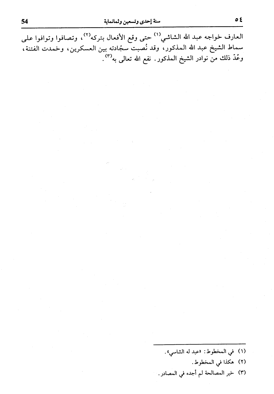 العارف خواجه عبد الله الشاشي (¬1) حتى وقع الأفعال بتركه (¬2)، وتصافوا وتوافوا على سماط الشيخ عبد الله المذكور، وقد نصبت سجّادته بين العسكرين، وخمدت الفتنة، وعدّ ذلك من نوادر الشيخ المذكور. نفع الله تعالى به (¬3).