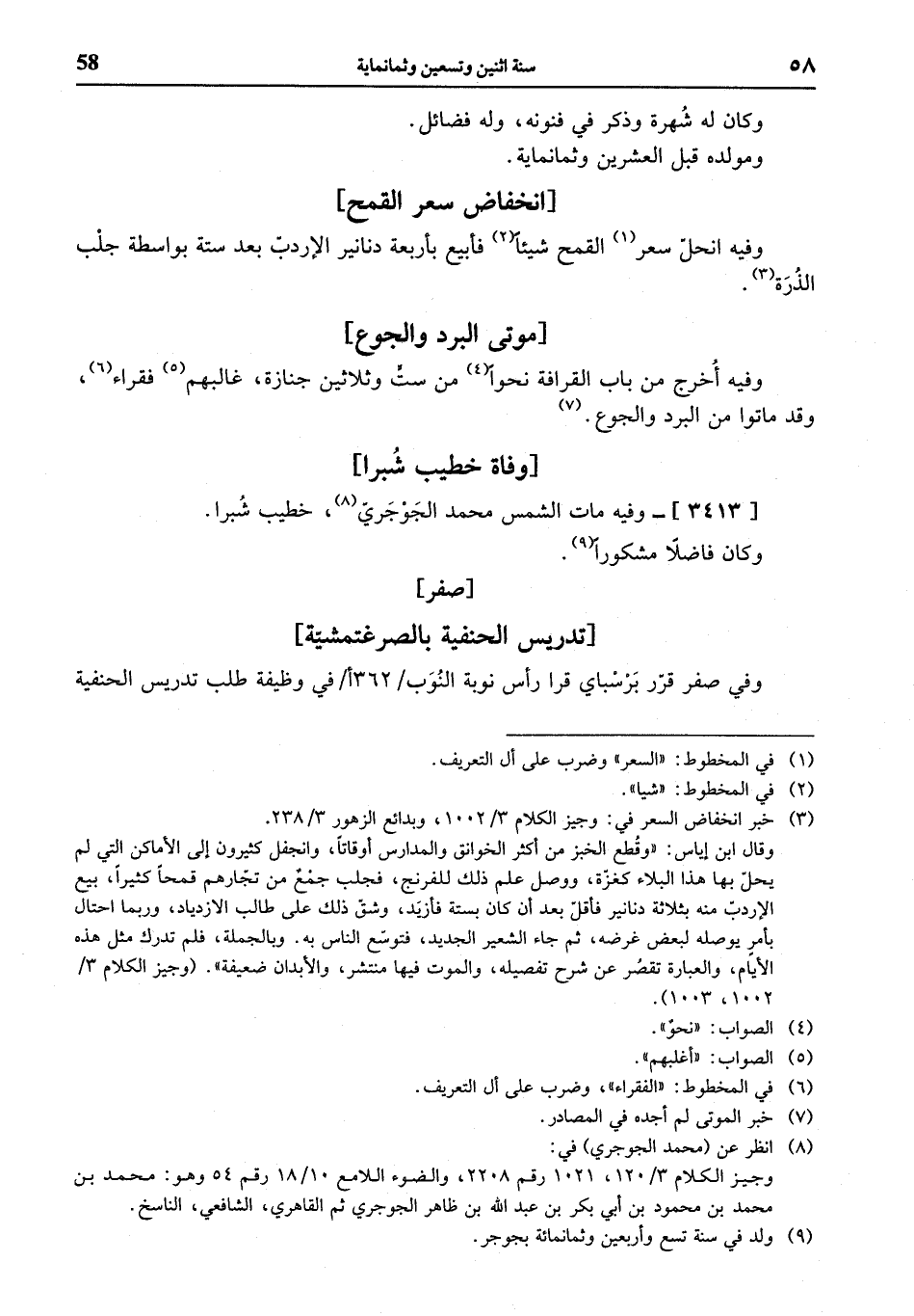 (¬8) انظر عن (محمد الجوجري) في: وجيز الكلام 3/ 120، 1021 رقم 2208، والضوء اللامع 10/ 18 رقم 54 وهو: محمد بن محمد بن محمود بن أبي بكر بن عبد الله بن ظاهر الجوجري ثم القاهري، الشافعي، الناسخ.