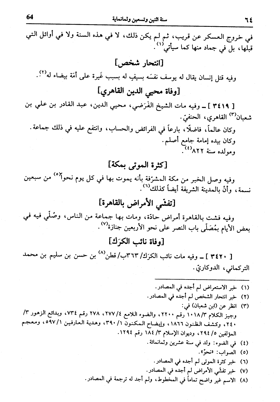 (¬3) انظر عن (ابن شعبان) في: وجيز الكلام 3/ 1018 رقم 2200، والضوء اللامع 4/ 277، 278 رقم 734، وبدائع الزهور 3/ 240، وكشف الظنون 1866، وإيضاح المكنون 1/ 390، وهدية العارفين 1/ 597، ومعجم المؤلفين 5/ 294، وديوان الإسلام 3/ 184 رقم 1294.