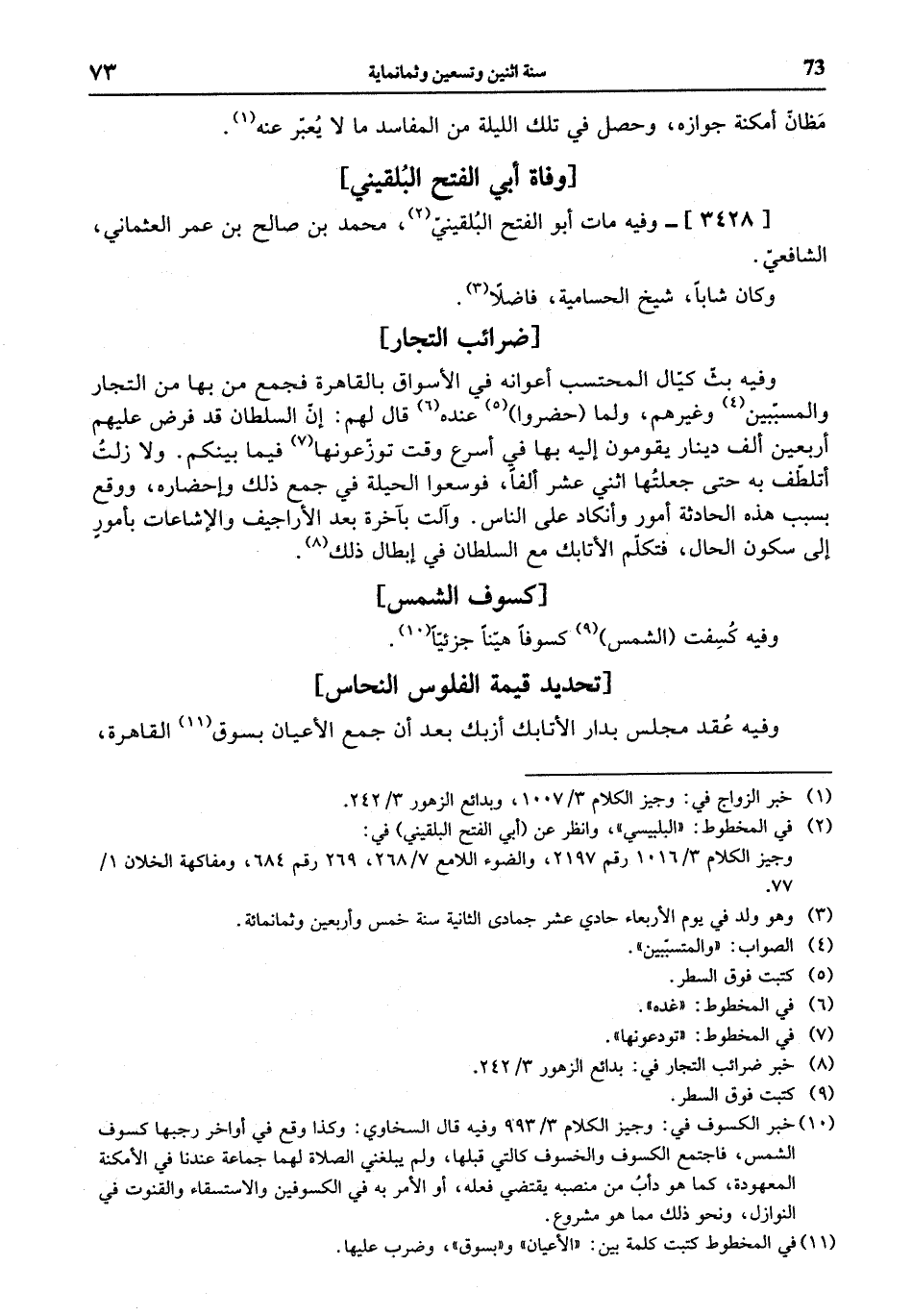 (¬10) خبر الكسوف في: وجيز الكلام 3/ 993 وفيه قال السخاوي: وكذا وقع في أواخر رجبها كسوف الشمس، فاجتمع الكسوف والخسوف كالتي قبلها، ولم يبلغني الصلاة لهما جماعة عندنا في الأمكنة المعهودة، كما هو دأب من منصبه يقتضي فعله، أو الأمر به في الكسوفين والاستسقاء والقنوت في النوازل، ونحو ذلك مما هو مشروع.