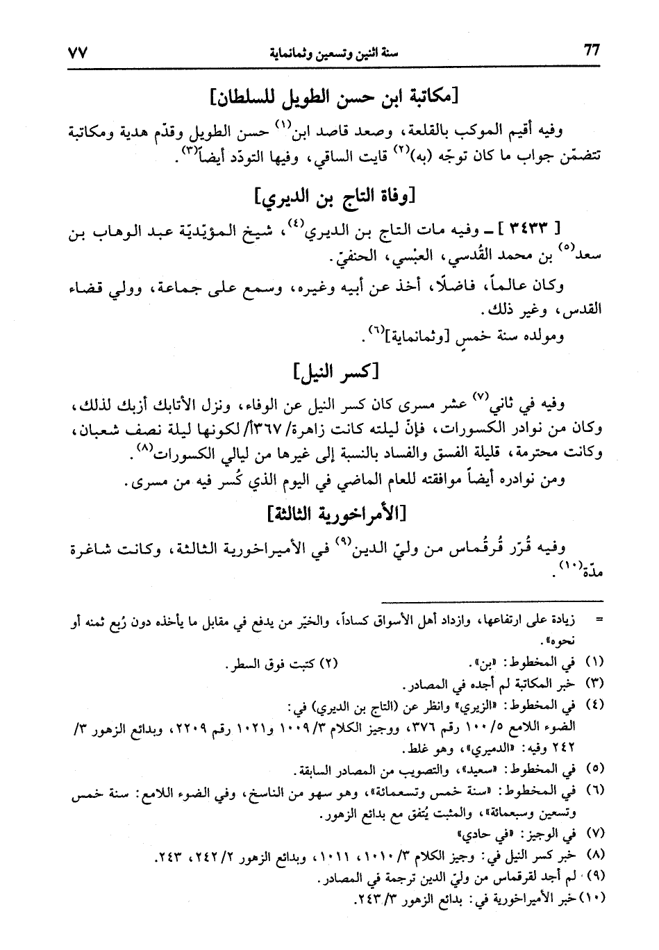 (¬4) في المخطوط: «الزيري» وانظر عن (التاج بن الديري) في: الضوء اللامع 5/ 100 رقم 376، ووجيز الكلام 3/ 1009 و 1021 رقم 2209، وبدائع الزهور 3/ 242 وفيه: «الدميري»، وهو غلط.