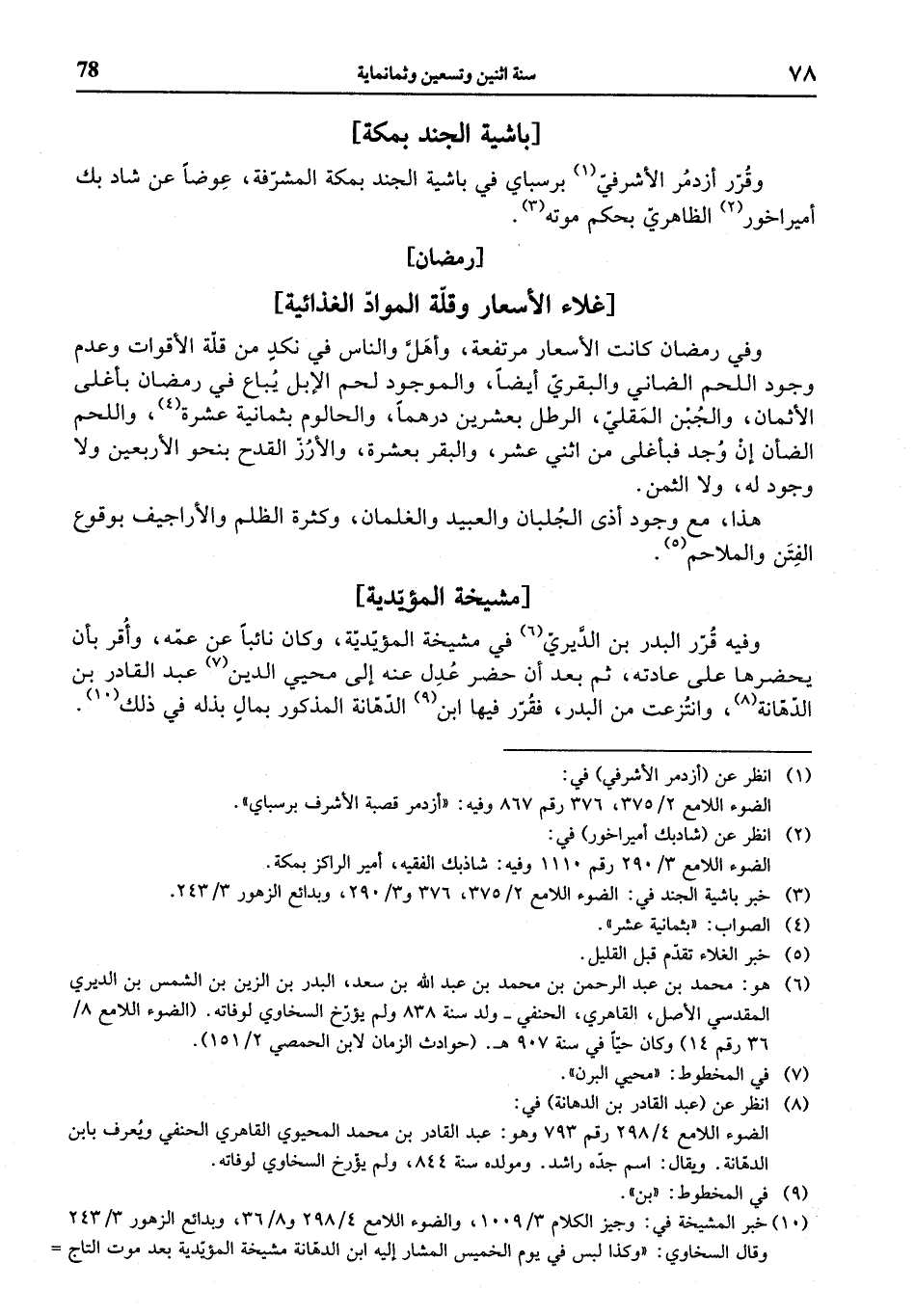 (¬8) انظر عن (عبد القادر بن الدهانة) في: الضوء اللامع 4/ 298 رقم 793 وهو: عبد القادر بن محمد المحيوي القاهري الحنفي ويعرف بابن الدهّانة. ويقال: اسم جدّه راشد. ومولده سنة 844، ولم يؤّرخ السخاوي لوفاته.