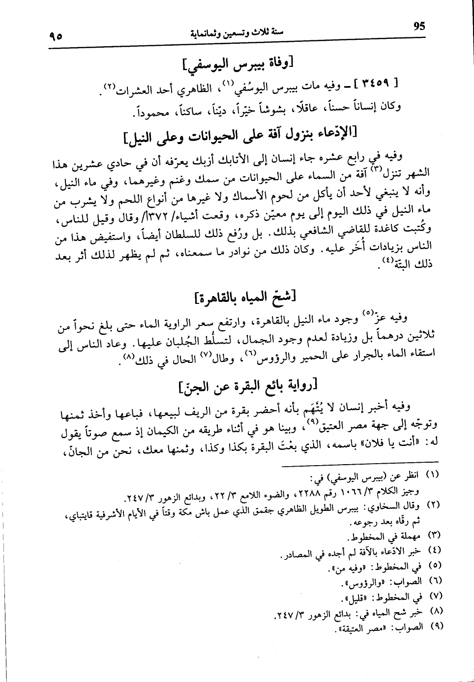 وفيه في رابع عشره جاء إنسان إلى الأتابك أزبك يعرّفه أن في حادي عشرين هذا الشهر تنزل (¬3) آفة من السماء على الحيوانات من سمك وغنم وغيرهما، وفي ماء النيل، وأنه لا ينبغي لأحد أن يأكل من لحوم الأسماك ولا غيرها من أنواع اللحم ولا يشرب من ماء النيل في ذلك اليوم إلى يوم معيّن ذكره، وقعت أشياء / 372 أ / وقال وقيل للناس، وكتبت كاغدة للقاضي الشافعي بذلك. بل ورفع ذلك للسلطان أيضا، واستفيض هذا من الناس بزيادات أخر عليه. وكان ذلك من نوادر ما سمعناه، ثم لم يظهر لذلك أثر بعد ذلك البتّة (¬4).