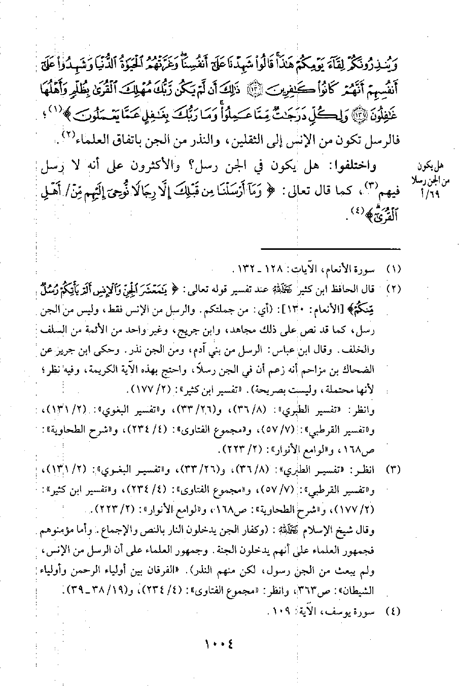 واختلفوا: هل يكون في الجن رسل؟ والأكثرون على أنّه لا رسل فيهم3، كما قال تعالى: {وَمَا أَرْسَلْنَا مِنْ قَبْلِكَ إِلاَّ رِجَالاً نُوحِي إِلَيهِمْ مِنْ أَهْلِ القُرَى} 4.